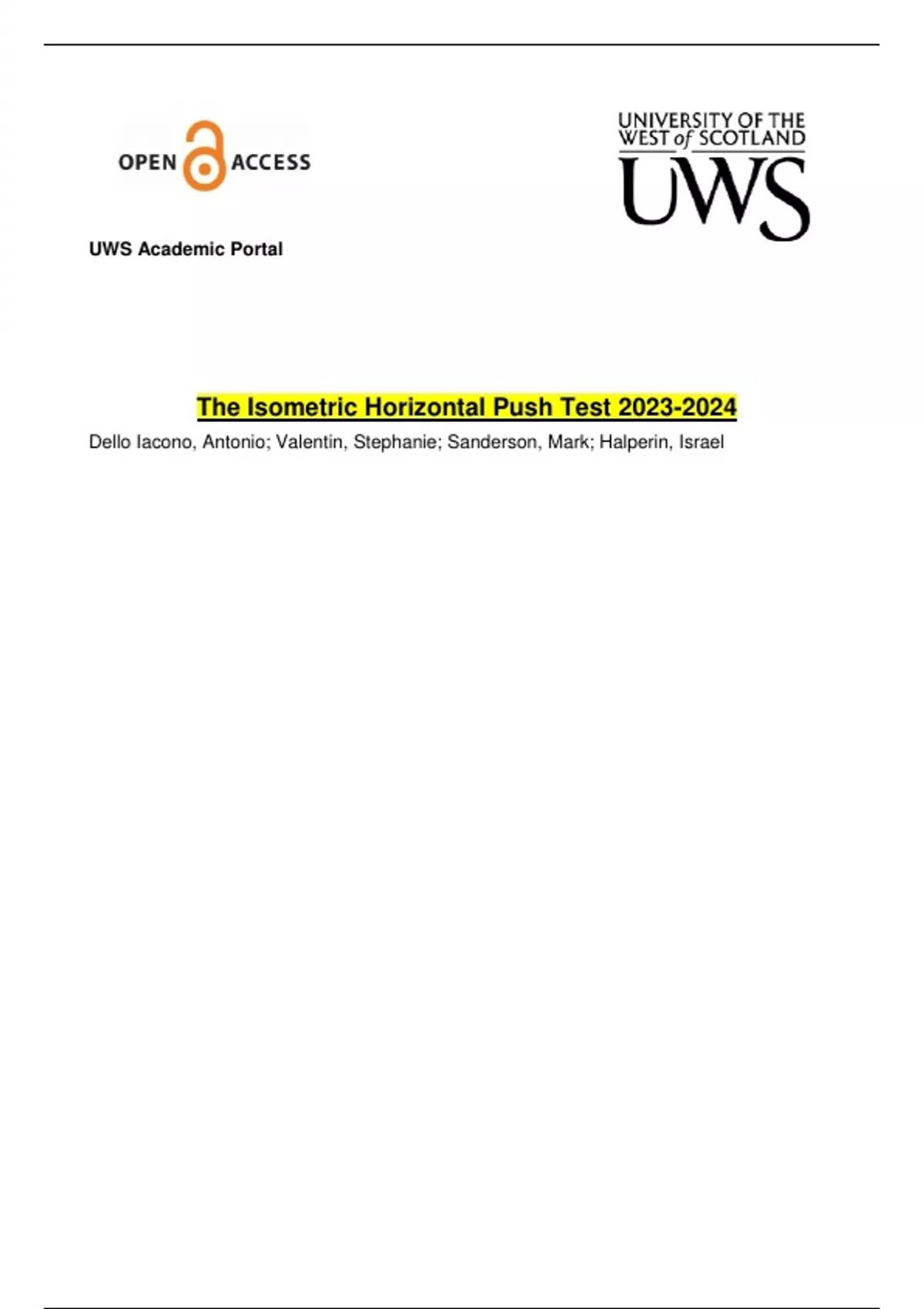 27 Abstract 28 Purpose: To investigate the test-retest reliability and criterion validity of the Isometric 29 Horizontal Push Test (IHPT), a newly designed test that selectively measures the 30 horizontal component of maximal isometric force. Methods: Twenty four active males 31 with ≥ 3 years of resistance training experience performed two testing sessions of the 32 IHPT, separated by 3–4 days of rest. In each session, subjects performed three maximal 33 trials of the IHPT with 3-min of rest between them. The peak force outputs were 34 collected simultaneously using a strain gauge, and the criterion equipment, consisting of a 35 floor-embedded force plate. Results: The test-retest reliability of peak force values was 36 nearly perfect (ICC ~0.99). Bland-Altman analysis showed excellent agreement between 37 days with nearly no bias for strain gauge 1.2N (95% CI: -3, 6N) and force plate 0.8N 38 (95% CI: -4, 6N). A nearly perfect correlation was observed between the strain gauge and 39 force plate (r= 0.98, p< 0.001), with a small bias of 8N (95% CI: 1.2, 15N) in favor of the 40 force plate. The sensitivity of the IHPT was also good, with SWC > SEM for both the 41 strain gauge (SWC: 29N; SEM: 17N [95% CI: 14, 20N]) and the force plate (SWC: 29N; 42 SEM: 18N [95% CI: 14, 19N]) devices. Conclusions: The high degree of validity, 43 reliability and sensitivity of the IHPT, coupled with its affordability, portability, ease of 44 use, and time efficacy, point to the potential of the test for assessment and monitoring 45 purposes. 46 47 Keywords: Continues...