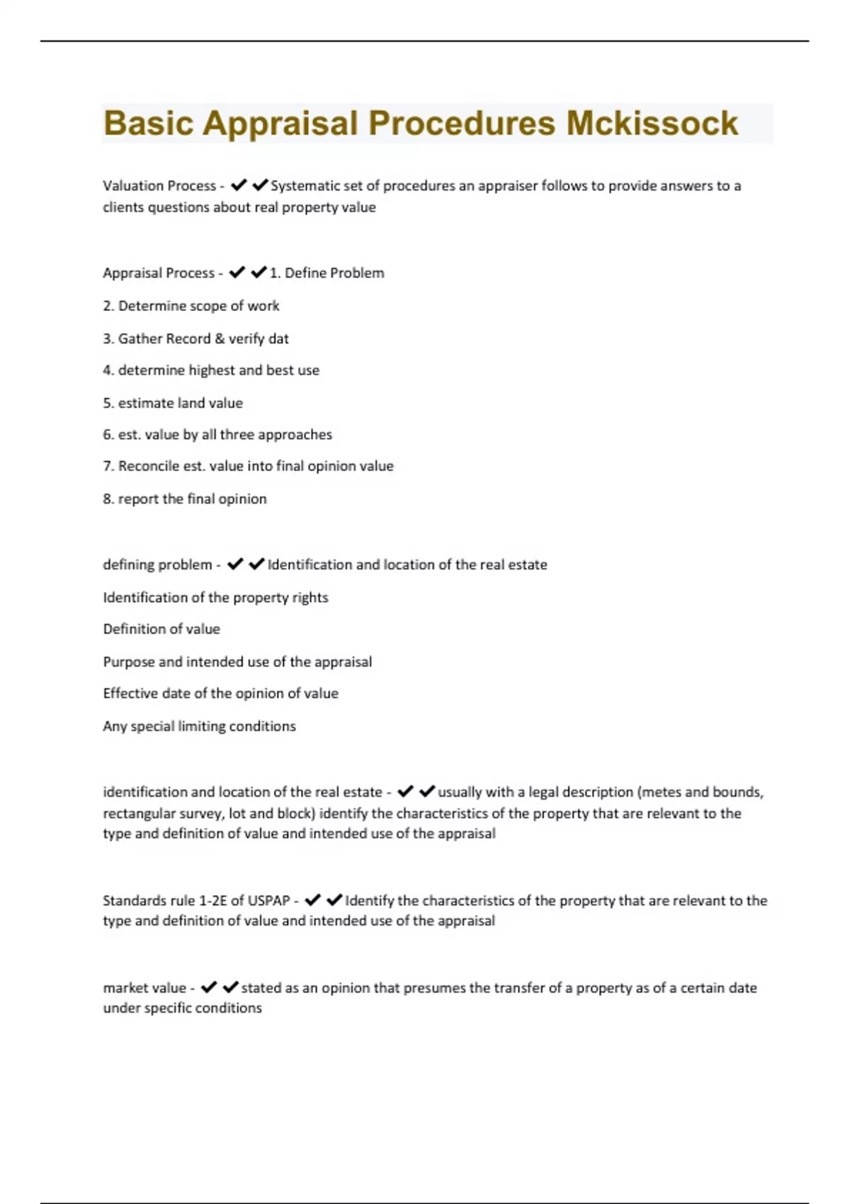 Valuation Process - Systematic set of procedures an appraiser follows to provide answers to a clients questions about real property value Appraisal Process - 1. Define Problem 2. Determine scope of work 3. Gather Record & verify dat 4. determine highest and best use 5. estimate land value 6. est. value by all three approaches 7. Reconcile est. value into final opinion value 8. report the final opinion defining problem - Identification and location of the real estate Identification of the property rights Definition of value Purpose and intended use of the appraisal Effective date of the opinion of value Any special limiting conditions identification and location of the real estate - usually with a legal description (metes and bounds, rectangular survey, lot and block) identify the characteristics of the property that are relevant to the type and definition of value and intended use of the appraisal Standards rule 1-2E of USPAP - Identify the characteristics of the property that are relevant to the type and definition of value and intended use of the appraisal market value - stated as an opinion that presumes the transfer of a property as of a certain date under specific conditionsAppraisers are cautioned to - identify the exact definition of market value and its authority applicable in each appraisal completed for the purpose of market value Standards 1-2c of USPAP -identify type of value, if opinion to be developed market value, ascertain whether the value is to be the most probable price: terms of cash; terms of financial arrangements equ. to cahs; other terms; if not market value must be clearly identified purpose of the assignment - objective of assignment. ex: to develop an opinion of the defined value of a specified interest in real estate intended user - client and any other party as identified by name or type as users of the appraisal review report by the appraiser retrospective and prospective value - Two dates are essential to an appraisal report. Standards Rules 2-2(a)(vi) and 2-2(b)(vi) and 8-2(a)(vi) and 8-2(b)(vi) require that each appraisal report specify the effective date of the appraisal and the date of the report