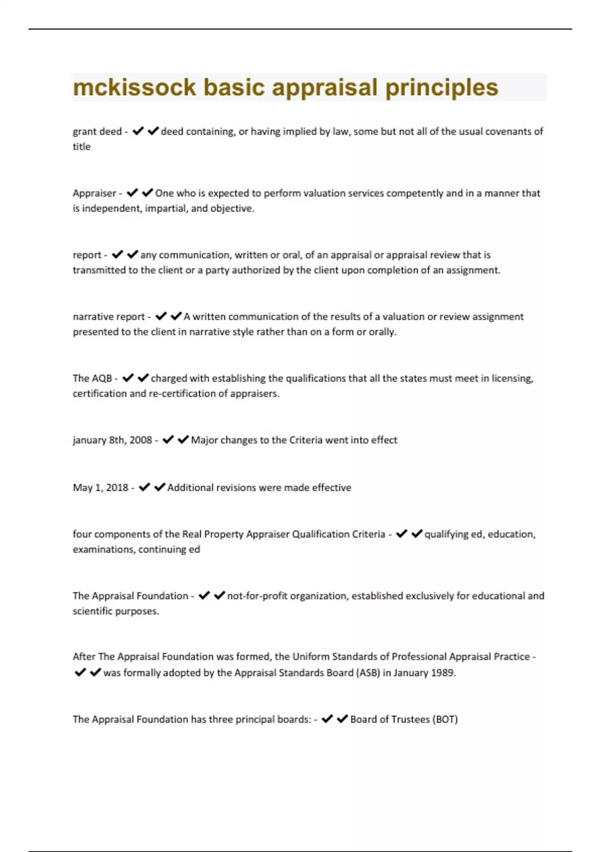 grant deed - deed containing, or having implied by law, some but not all of the usual covenants of title Appraiser - One who is expected to perform valuation services competently and in a manner that is independent, impartial, and objective. report - any communication, written or oral, of an appraisal or appraisal review that is transmitted to the client or a party authorized by the client upon completion of an assignment. narrative report - A written communication of the results of a valuation or review assignment presented to the client in narrative style rather than on a form or orally. The AQB - charged with establishing the qualifications that all the states must meet in licensing, certification and re-certification of appraisers. january 8th, 2008 - Major changes to the Criteria went into effect May 1, 2018 - Additional revisions were made effective four components of the Real Property Appraiser Qualification Criteria - qualifying ed, education, examinations, continuing ed The Appraisal Foundation - not-for-profit organization, established exclusively for educational and scientific purposes. After The Appraisal Foundation was formed, the Uniform Standards of Professional Appraisal Practice - was formally adopted by the Appraisal Standards Board (ASB) in January 1989. The Appraisal Foundation has three principal boards: - Board of Trustees (BOT)Appraisal Standards Board (ASB) Appraiser Qualifications Board (AQB) The BOT - acts as an executive board for the Foundation. The ASB - responsible for creating standards for ethics and performance of appraisers. Uniform Standards of Professional Appraisal Practice (USPAP) - was developed by the Ad Hoc Committee in 1986 and 1987 and was copyrighted in 1987 by The Appraisal Foundation. At its first meeting in 1989, the Appraisal Standards Board (ASB) - adopted USPAP as the governing document. USPAP may be - amended, interpreted, supplemented, or retired only by the ASB. Congress recognized USPAP - as the generally recognized standards of practice in the appraisal profession in Title XI of the Financial Institutions Reform the Appraisal Subcommittee (ASC) - is a federal entity with oversight authority over the state licensing and certification agencies AMCs - appraisal management companies The Board of Trustees - omposed of 21 individuals responsible for funding The Appraisal Foundation and appointing the members to The Appraisal Foundation's other boards - the Appraisal Standards Board and the Appraiser Qualifications Board.