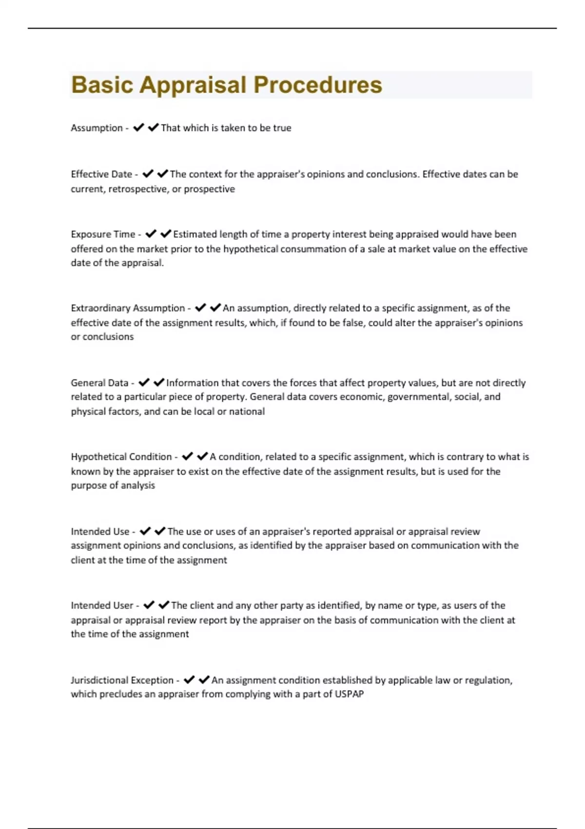 Assumption - That which is taken to be true Effective Date - The context for the appraiser's opinions and conclusions. Effective dates can be current, retrospective, or prospective Exposure Time - Estimated length of time a property interest being appraised would have been offered on the market prior to the hypothetical consummation of a sale at market value on the effective date of the appraisal. Extraordinary Assumption - An assumption, directly related to a specific assignment, as of the effective date of the assignment results, which, if found to be false, could alter the appraiser's opinions or conclusions General Data - Information that covers the forces that affect property values, but are not directly related to a particular piece of property. General data covers economic, governmental, social, and physical factors, and can be local or national Hypothetical Condition - A condition, related to a specific assignment, which is contrary to what is known by the appraiser to exist on the effective date of the assignment results, but is used for the purpose of analysis Intended Use - The use or uses of an appraiser's reported appraisal or appraisal review assignment opinions and conclusions, as identified by the appraiser based on communication with the client at the time of the assignment Intended User - The client and any other party as identified, by name or type, as users of the appraisal or appraisal review report by the appraiser on the basis of communication with the client at the time of the assignment Jurisdictional Exception - An assignment condition established by applicable law or regulation, which precludes an appraiser from complying with a part of USPAPLimiting conditions - Statements intended to protect the appraiser and inform the client and other intended users of the appraisal report of limitations placed by the appraiser.