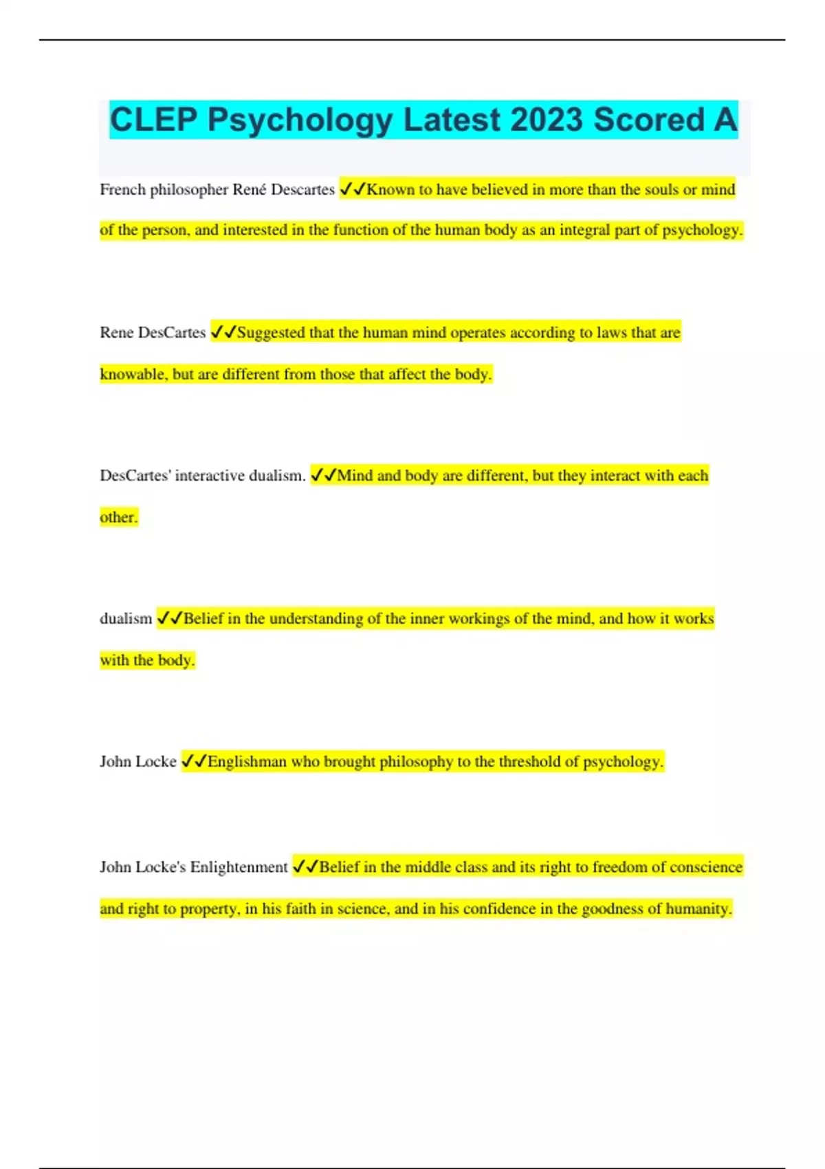 CLEP Psychology Latest 2023 Scored A French philosopher René Descartes Known to have believed in more than the souls or mind of the person, and interested in the function of the human body as an integral part of psychology. Rene DesCartes Suggested that the human mind operates according to laws that are knowable, but are different from those that affect the body. DesCartes' interactive dualism. Mind and body are different, but they interact with each other. dualism Belief in the understanding of the inner workings of the mind, and how it works with the body. John Locke Englishman who brought philosophy to the threshold of psychology. John Locke's Enlightenment Belief in the middle class and its right to freedom of conscience and right to property, in his faith in science, and in his confidence in the goodness of humanity. Locke's British Empiricism Focused on the content of the mind and claimed that it is acquired through experience. Wilhelm Wundt German physiologist and psychologist who founded the first laboratory for experimental psychology and stressed the use of scientific methods in psychology, particularly through the use of introspection. structuralism Theory that uses culturally interconnected signs to reconstruct systems of relationships rather than studying isolated, material things in themselves. Englishman Edward Titchener Responsible for the refinement of introspection--to look within. American philosopher William James First opened the formal study of psychology within the classroom at Harvard. functionalism or functional psychology New type of psychology that was largely American. It was well-established by the 1920's, and was most popular at the University of Chicago. functionalism theory Theory that stressed the importance