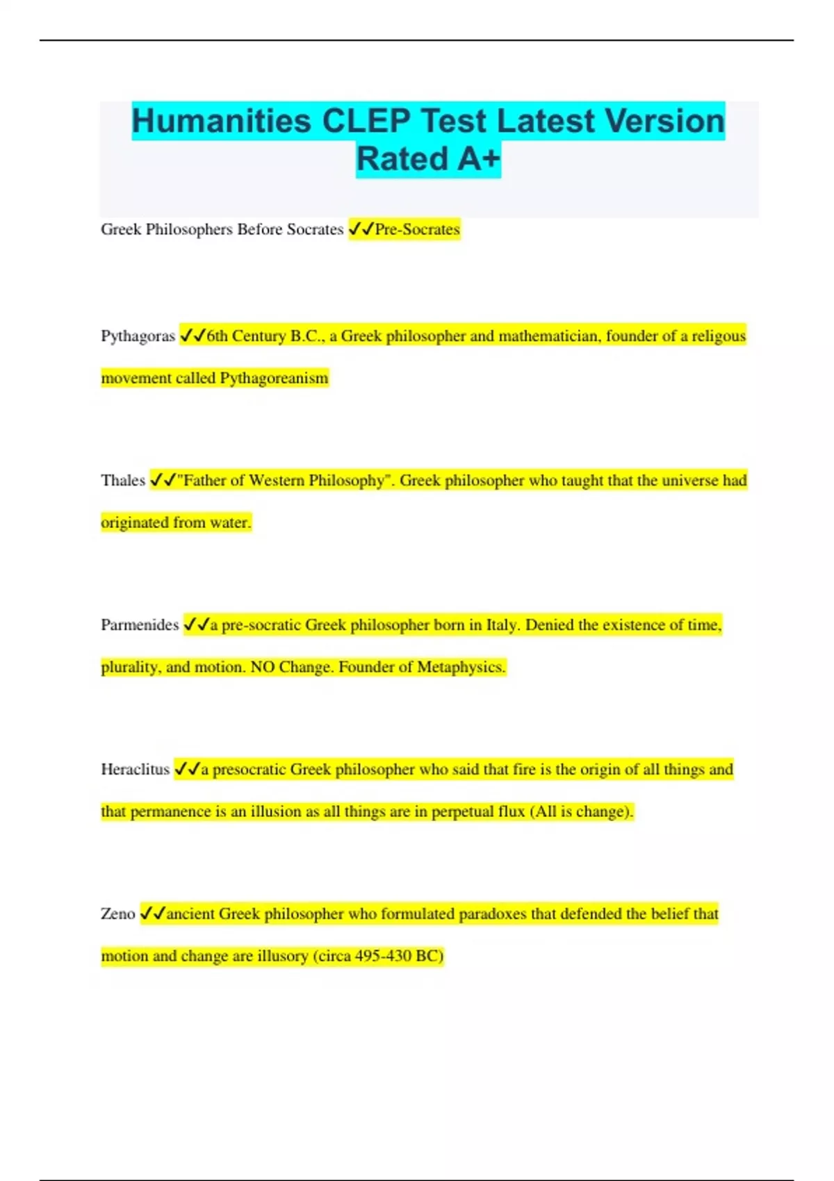 Humanities CLEP Test Latest Version Rated A+ Greek Philosophers Before Socrates Pre-Socrates Pythagoras 6th Century B.C., a Greek philosopher and mathematician, founder of a religous movement called Pythagoreanism Thales "Father of Western Philosophy". Greek philosopher who taught that the universe had originated from water. Parmenides a pre-socratic Greek philosopher born in Italy. Denied the existence of time, plurality, and motion. NO Change. Founder of Metaphysics. Heraclitus a presocratic Greek philosopher who said that fire is the origin of all things and that permanence is an illusion as all things are in perpetual flux (All is change). Zeno ancient Greek philosopher who formulated paradoxes that defended the belief that motion and change are illusory (circa 495-430 BC) Socrates Greek philosopher; socratic method--questioning; sentenced to death for corrupting Athens youth. Believed writing distorted ideas. His ideas were recorded by his followers (Plato). Atomism The idea that matter is made out of atoms Atomists Leucippus and Democritus Plato one of Socrates' students; was considered by many to be the GREATEST philosopher of western civilization. Explained his ideas about government in a work entitled The Republic. In his ideal state, the people were divided into three different groups. Aristotle Greek philosopher. A pupil of Plato, the tutor of Alexander the Great, and the author of works on logic, metaphysics, ethics, natural sciences, politics, and poetics, he profoundly influenced Western thought. In his philosophical system, which led him to criticize what he saw as Plato's metaphysical excesses, theory follows empirical observation and logic, based on the syllogism, is the essential method of rational inquiry. pop art an artistic movement that emerged in the early 1960s; pop artists took images from popular culture and transformed them into works of fine art mosaics patterns or pictures made by embedding small pieces of stone or glass in cement on surfaces such as walls and floors sculpture three dimensional work of art, statue bust a sculpture of the head and shoulders of a person obelisk tall, 4 sided pillar of stone that rises to a point multi-media using two or more types of media together to create an art object such as glitter or beads on a painting louise nevelson assembled architectural sculptures of "found" wooden objects and used them to construct screens of boxes of varied sizes which she painted in monochromatic colors. constantin brancusi (1876) 19th-20th c. Romanian sculptor known for highly simplified archetypical human and animal forms (The Kiss; Bird in Space) cellini goldsmith and sculptor, wrote one of the first autobiographies barbara hepworth British abstract sculptor michelangelo Italian Renaissance artist that painted the Sistine Chapel ceiling and sculpted the statue of David. henry moore abstract sculptor who used rounding techniques and very little detail alexander calder United States sculptor who first created mobiles and stabiles () hagia sophia Most famous example of Byzantine architecture, it was built under Justinian I and is considered one of the most perfect buildings in the world. Constructed of interlocking domes.