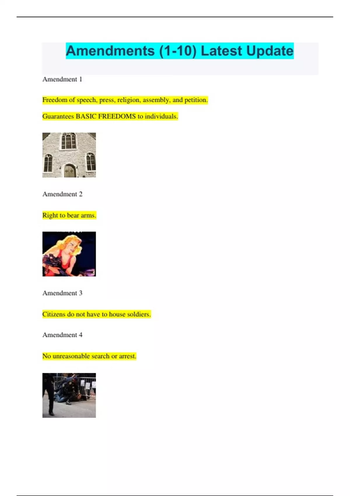 Amendments (1-10) Latest Update Amendment 1 Freedom of speech, press, religion, assembly, and petition. Guarantees BASIC FREEDOMS to individuals. Amendment 2 Right to bear arms. Amendment 3 Citizens do not have to house soldiers. Amendment 4 No unreasonable search or arrest. Amendment 5 No double jeopardy or no witness against yourself. Amendment 6 Rights of accused in criminal cases. Amendment 7 Trial by jury. Amendment 8 No excessive bail or cruel punishment. Amendment 9 People get rights not listed in Constitution. Amendment 10 Any rights not given to federal government are given to the states and people. Why was the Bill of Rights added to the Constitution? To clearly define the rights and freedom's of citizens. Freedom of Religion Government cannot support or interfere with religion Freedom of Speech and Press Right to express on ideas freedom of assembly freedom to hold meetings right to petition make a request of the government