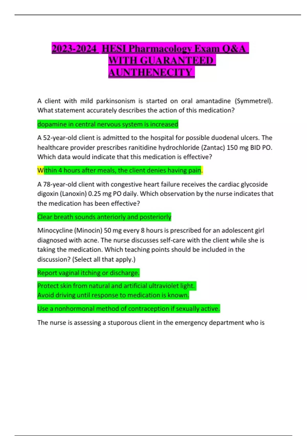 HESI Pharmacology Exam Q&A WITH GUARANTEED AUNTHENECITY
