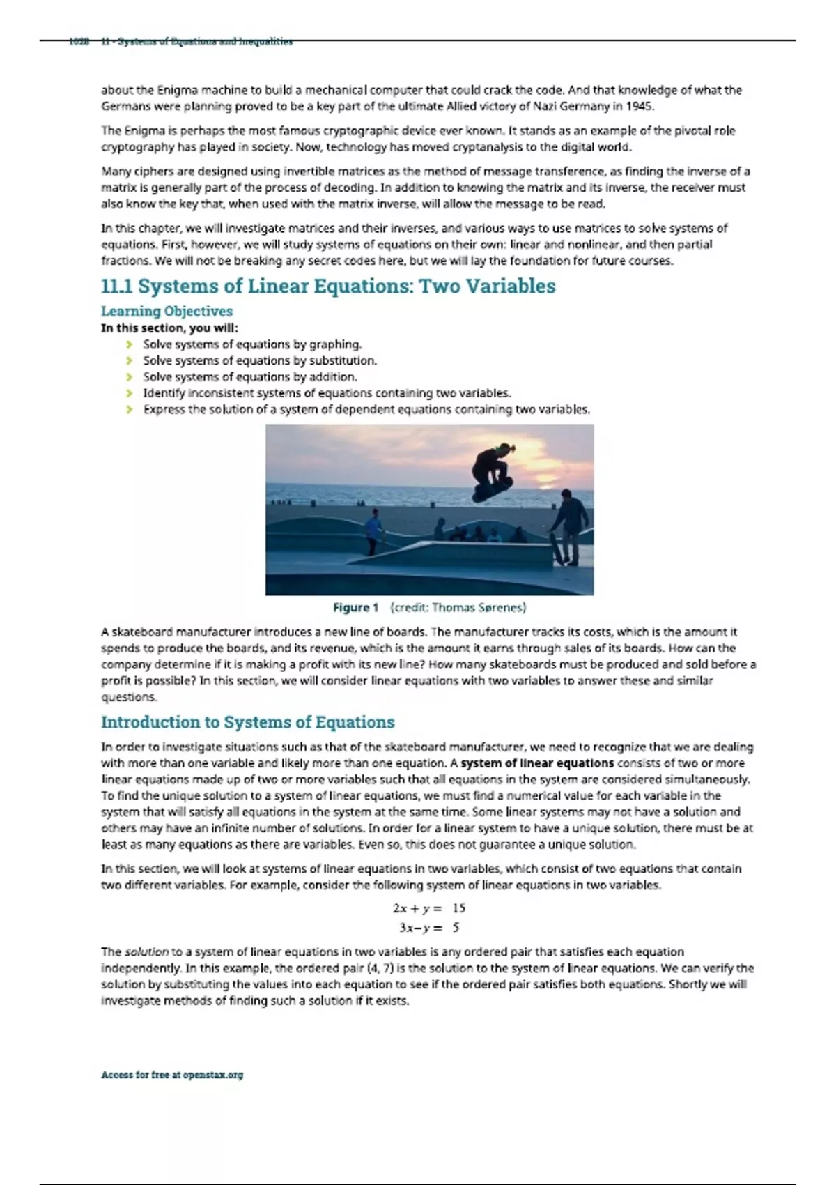 In this meticulously structured chapter, titled "11.1 Systems of Linear Equations Two Variables," readers are immersed in the world of algebraic problem-solving with a specific focus on systems of linear equations involving two variables. This chapter is a pivotal component of a comprehensive mathematics curriculum, designed to equip learners with the essential skills to analyze and solve real-world problems through mathematical modeling. The chapter commences by introducing the fundamental concept of a system of linear equations in two variables. It elucidates the mathematical representation of such systems and their significance in various fields, ranging from economics to engineering. Readers are guided through the process of solving these systems using various methods, including substitution, elimination, and graphical representations. Each method is presented with meticulous attention to detail, ensuring that learners develop a deep understanding of the underlying principles. Furthermore, this chapter explores the geometric interpretation of systems of linear equations in two variables, emphasizing the concept of intersecting lines as a means of solution. Readers will appreciate the visual representation of mathematical concepts, enhancing their grasp of the material. Throughout the chapter, practical examples and exercises are strategically integrated to reinforce comprehension and facilitate active learning. These exercises challenge readers to apply their newfound knowledge to solve a diverse range of problems, fostering problem-solving skills that transcend the confines of the classroom. "11.1 Systems of Linear Equations Two Variables" serves as a foundational building block for further mathematical exploration, providing learners with the tools necessary to analyze complex systems, make informed decisions, and excel in various academic and professional pursuits. It is a testament to the meticulous approach to mathematics education, ensuring that readers are well-prepared for the challenges and opportunities that lie ahead in their educational journey.
