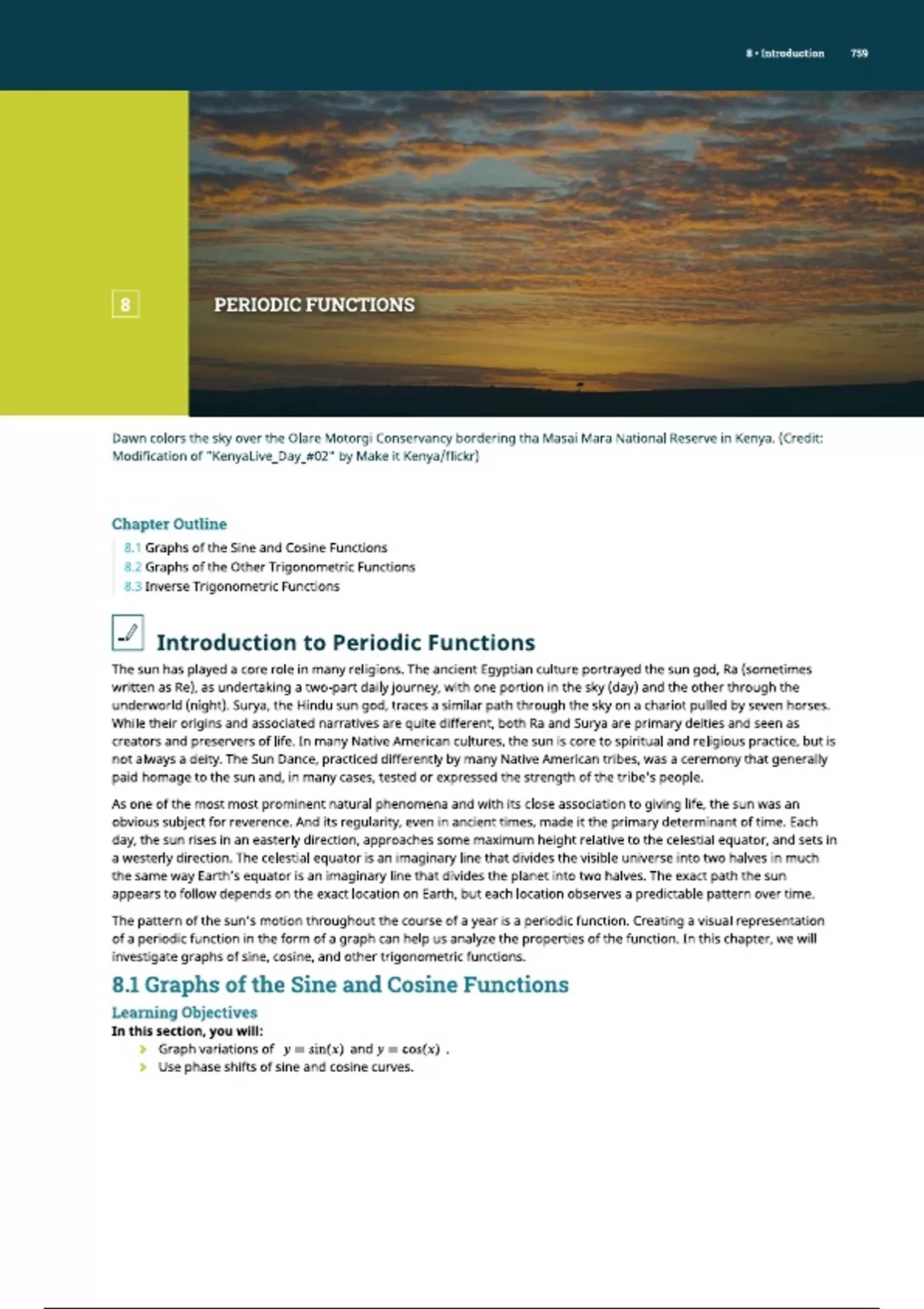 In this meticulously crafted chapter, titled "8.1 Graphs of the Sine and Cosine Functions," readers embark on a comprehensive exploration of two fundamental trigonometric functions: sine and cosine. These functions are central to the study of mathematics and have far-reaching applications in fields such as physics, engineering, and signal processing. The chapter commences by introducing the sine and cosine functions, providing a clear mathematical definition and elucidating their intrinsic properties. Readers will gain a profound understanding of the periodic nature of these functions, setting the stage for a deeper analysis. A significant portion of the chapter is dedicated to graphing the sine and cosine functions. Meticulous attention is given to plotting these functions accurately, exploring their amplitude, frequency, and phase shifts. Through detailed explanations and step-by-step examples, readers will master the art of creating precise graphs that visually represent the behavior of these essential trigonometric functions. Furthermore, the chapter delves into the concept of trigonometric identities and their relevance in manipulating sine and cosine functions. This knowledge empowers readers to simplify complex expressions and solve a wide array of mathematical problems. Practical applications of sine and cosine functions are highlighted throughout the chapter. From modeling periodic phenomena to analyzing waveforms, readers will appreciate the real-world significance of these functions and their graphs. To reinforce understanding, the chapter includes a wealth of exercises and problems, challenging readers to apply their knowledge in diverse scenarios. These exercises promote active learning and problem-solving skills, ensuring that readers are well-equipped to tackle complex trigonometric challenges. "8.1 Graphs of the Sine and Cosine Functions" stands as a vital resource for learners seeking a thorough understanding of these foundational trigonometric functions. Its meticulous approach to graphing and interpretation empowers readers to confidently navigate the world of trigonometry, making it an indispensable asset in mathematics education.