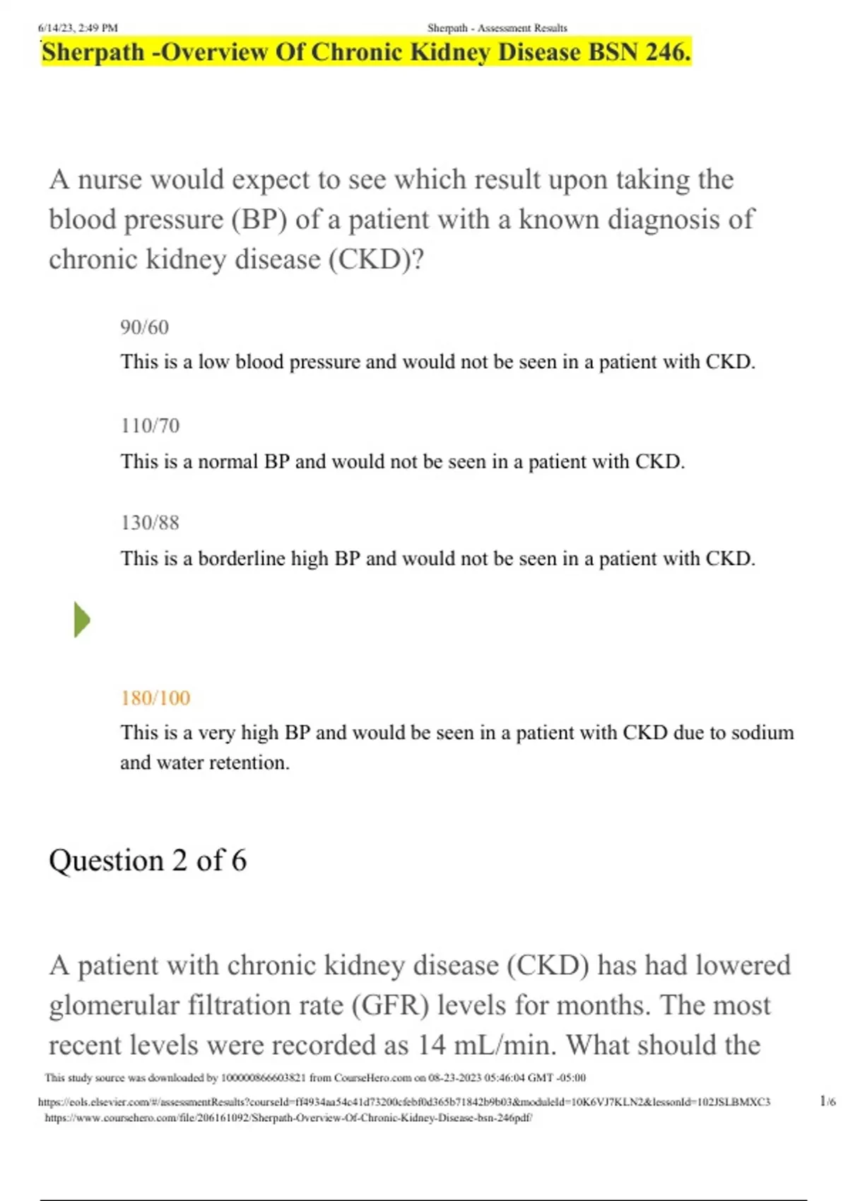 Sherpath -Overview Of Chronic Kidney Disease BSN 246. A nurse would expect to see which result upon taking the blood pressure (BP) of a patient with a known diagnosis of chronic kidney disease (CKD)? 90/60 This is a low blood pressure and would not be seen in a patient with CKD. 110/70 This is a normal BP and would not be seen in a patient with CKD. 130/88 This is a borderline high BP and would not be seen in a patient with CKD. 180/100 This is a very high