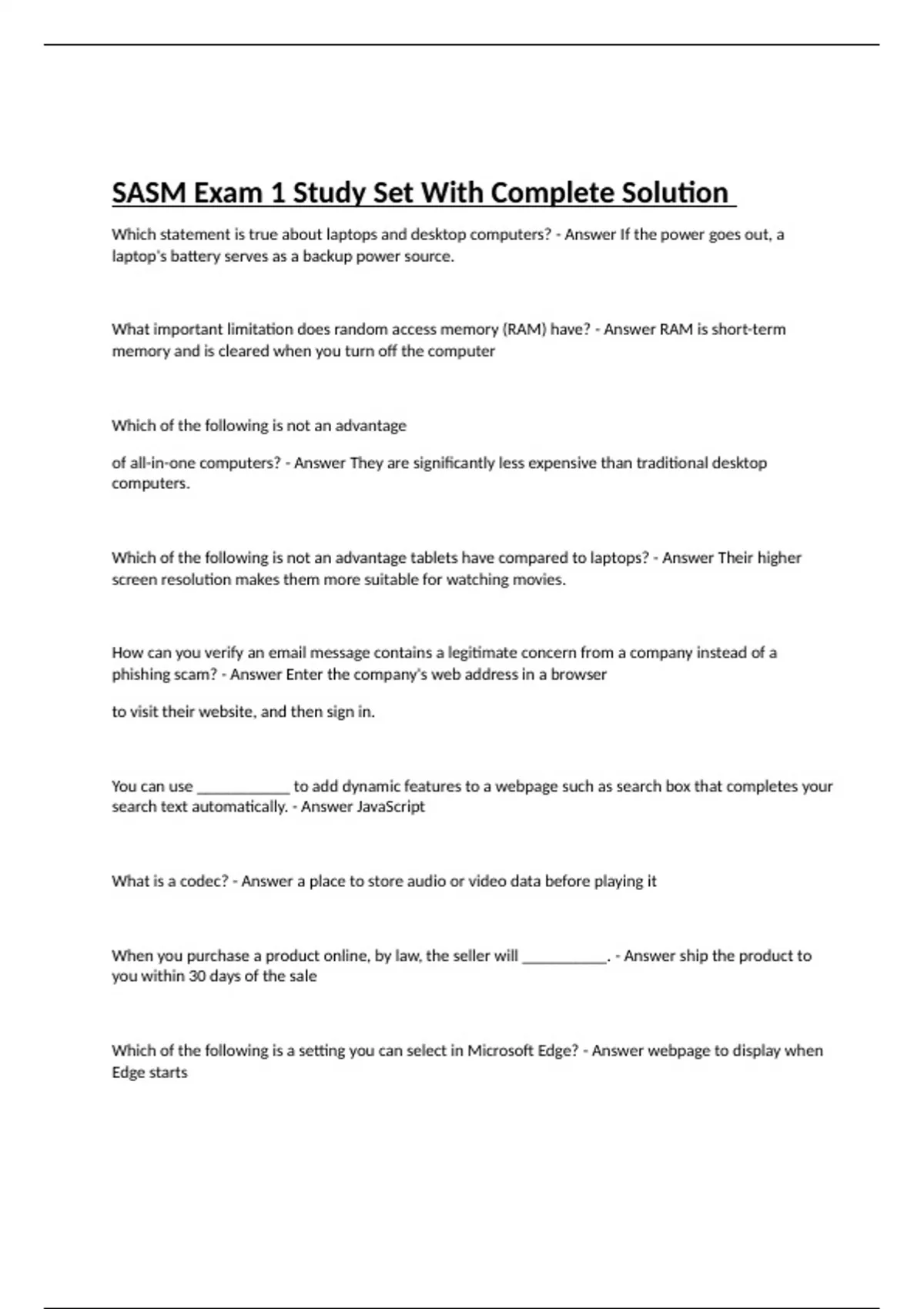 Which statement is true about laptops and desktop computers? - Answer If the power goes out, a laptop's battery serves as a backup power source. What important limitation does random access memory (RAM) have? - Answer RAM is short-term memory and is cleared when you turn off the computer Which of the following is not an advantage of all-in-one computers? - Answer They are significantly less expensive than traditional desktop computers. Which of the following is not an advantage tablets have compared to laptops? - Answer Their higher screen resolution makes them more suitable for watching movies.
