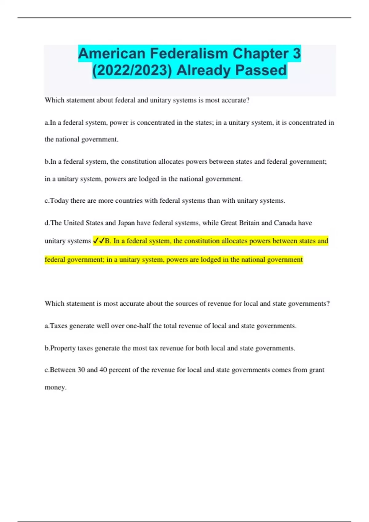 American Federalism Chapter 3 (2022/2023) Already Passed Which statement about federal and unitary systems is most accurate? a.In a federal system, power is concentrated in the states; in a unitary system, it is concentrated in the national government. b.In a federal system, the constitution allocates powers between states and federal government; in a unitary system, powers are lodged in the national government. c.Today there are more countries with federal systems than with unitary systems. d.The United States and Japan have federal systems, while Great Britain and Canada have unitary systems B. In a federal system, the constitution allocates powers between states and federal government; in a unitary system, powers are lodged in the national government Which statement is most accurate about the sources of revenue for local and state governments? a.Taxes generate well over one-half the total revenue of local and state governments. b.Property taxes generate the most tax revenue for both local and state governments. c.Between 30 and 40 percent of the revenue for local and state governments comes from grant money. d.Local and state governments generate an equal amount of revenue from issuing licenses and certificates. c.Between 30 and 40 percent of the revenue for local and state governments comes from grant money. In McCulloh vs. Maryland, the Supreme Court invoked which provisions of the constitution? a.Tenth Amendment and spending clause rce clause and supremacy clause sary and proper clause and supremacy clause g power and necessary and proper clause C. necessary and proper clause and supremacy clause Which statement about new federalism is not true? a.New federalism was launched by President Nixon and continued by President Reagan. b.New federalism is based on the idea that decentralization of responsibility enhances administrative efficiency. c.United States v. Lopez is a Supreme Court ruling that advanced the logic of new federalism. d.President Reagan was able to promote new federalism consistently throughout his administration. D. President Reagan was able to promote new federalism consistently throughout his administration. ` Which is not a merit of cooperative federalism? a.Federal cooperation helps mitigate the problem of collective action among states. b.Federal assistance encourages state and local governments to generate positive externalities. c.Cooperative federalism respects the traditional jurisdictional boundaries between states and federal government. d.Federal assistance ensures some degree of uniformity of public services across states. c.Cooperative federalism respects the traditional jurisdictional boundaries between states and federal government. Which statement about federal grants in recent decades is most accurate? a.The federal government allocates the most grant money to income security. b.The amount of federal grant money going to states has steadily increased since the 1960s. c.The majority of federal grants are block grants. d.Block grants tend to gain more flexibility over time. b.The amount of federal grant money going to states has steadily increased since the 1960s. Which statement about unfunded mandates is false? a.The Unfunded Mandates Reform Act has prevented Congress from using unfunded mandates. b.The Clean Air Act is a type of federal partial preemptive regulation. c.Title VI of the Civil Rights Act establishes crosscutting requirements. d.New federalism does not promote the use of unfunded mandates. d.New federalism does not promote the use of unfunded mandates. Which statement about immigration federalism is false? a.The Arizona v. United States decision struck down all Arizona's most restrictive provisions on illegal immigration. b.Since the 1990s, states have increasingly moved into the policy domain of immigration. c.Federal immigration laws trump state laws. d.States' involvement in immigration is partly due to their interest in preventing illegal immigrants from accessing public services such as education and welfare benefits. a.The Arizona v. United States decision struck down all Arizona's most restrictive provisions on illegal immigration. Which statement about the evolution of same-sex marriage is false? a.The federal government became involved in this issue when it passed DOMA. b.In the 1990s and 2000s, the number of state restrictions on same-sex marriage increased. c.United States v. Windsor legalized same-sex marriage in the United States. d.More than half the states had legalized same-sex marriage by the time the Supreme Court made same-sex marriage legal nationwide in 2015. c.United States v. Windsor legalized same-sex marriage in the United States Which statement about venue shopping is true? a.MADD steered the drinking age issue from the federal government down to the states. b.Anti-abortion advocates have steered the abortion issue from the states up to the federal government. c.Both MADD and anti-abortion proponents redirected their advocacy from the states to the federal government. d.None of the statements are correct. d.None of the statements are correct. Which of the following is not a benefit of federalism? a.Federalism promotes political participation. b.Federalism encourages economic equality across the country. c.Federalism provides for multiple levels of government action. d.Federalism accommodates a diversity of opinion. b.Federalism encourages economic equality across the country.