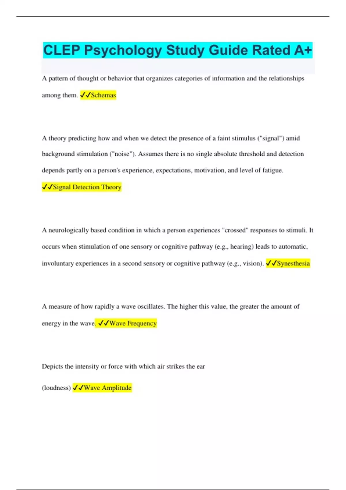 CLEP Psychology Study Guide Rated A+ A pattern of thought or behavior that organizes categories of information and the relationships among them. Schemas A theory predicting how and when we detect the presence of a faint stimulus ("signal") amid background stimulation ("noise"). Assumes there is no single absolute threshold and detection depends partly on a person's experience, expectations, motivation, and level of fatigue. Signal Detection Theory A neurologically based condition in which a person experiences "crossed" responses to stimuli. It occurs when stimulation of one sensory or cognitive pathway (e.g., hearing) leads to automatic, involuntary experiences in a second sensory or cognitive pathway (e.g., vision). Synesthesia A measure of how rapidly a wave oscillates. The higher this value, the greater the amount of energy in the wave. Wave Frequency Depicts the intensity or force with which air strikes the ear (loudness) Wave Amplitude Also known as pure light and are made up of waves of all one color Monochromatic Light Adapting or revising one's current understandings (schemas) to incorporate new information. Accommodation A form of psychological treatment in which the patient is exposed to a stimulus while simultaneously being subjected to some form of discomfort. e.g. applying an electric shock to a patient each time they attempt to drink alcohol Aversion Therapy The most basic and fundamental type of learning Conditioning Training of an organism to withdraw from an unpleasant stimulus before it starts Avoidance conditioning A type of learning in which one learns to link two or more stimuli and anticipate events e.g. Ivan Pavlov's dogs that salivate at the sound of a bell In this example, salivating is a NORMAL (classical) response to food. Classical Conditioning *A response not normally associated with a given stimulus. *In Pavlov's experiment, the dogs started salivating even if there was no food. Dogs do not normally salivate when a bell rings unless they knew from before that when a bell rings, food comes. Conditioned Response Ordinarily a neutral stimulus paired with a unconditioned stimulus to achieve a desired result and eventually produces the desired response in an organism when presented alone; in Pavlov's experiment, the bell Conditioned Stimulus A strategy that seeks to change behavior by modifying its consequences. Contingency Management Occurs when reinforcement is delivered after every single target behaviour Continuous Reinforcement (CRF) Schedule The ability to perceive and respond to differences among stimuli Discrimination (Psychology) When an aversive stimulus is presented, an animal