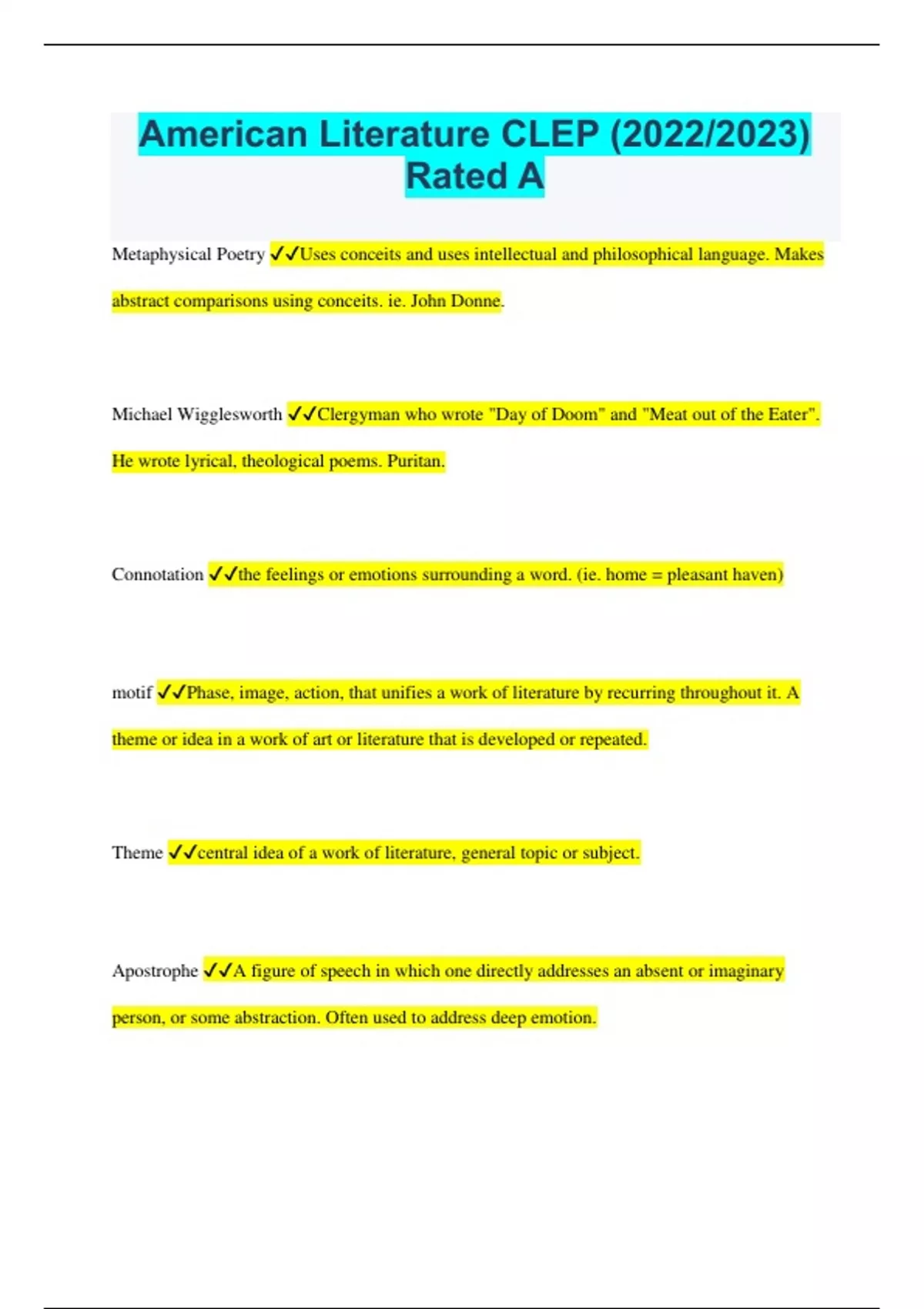 American Literature CLEP (2022/2023) Rated A