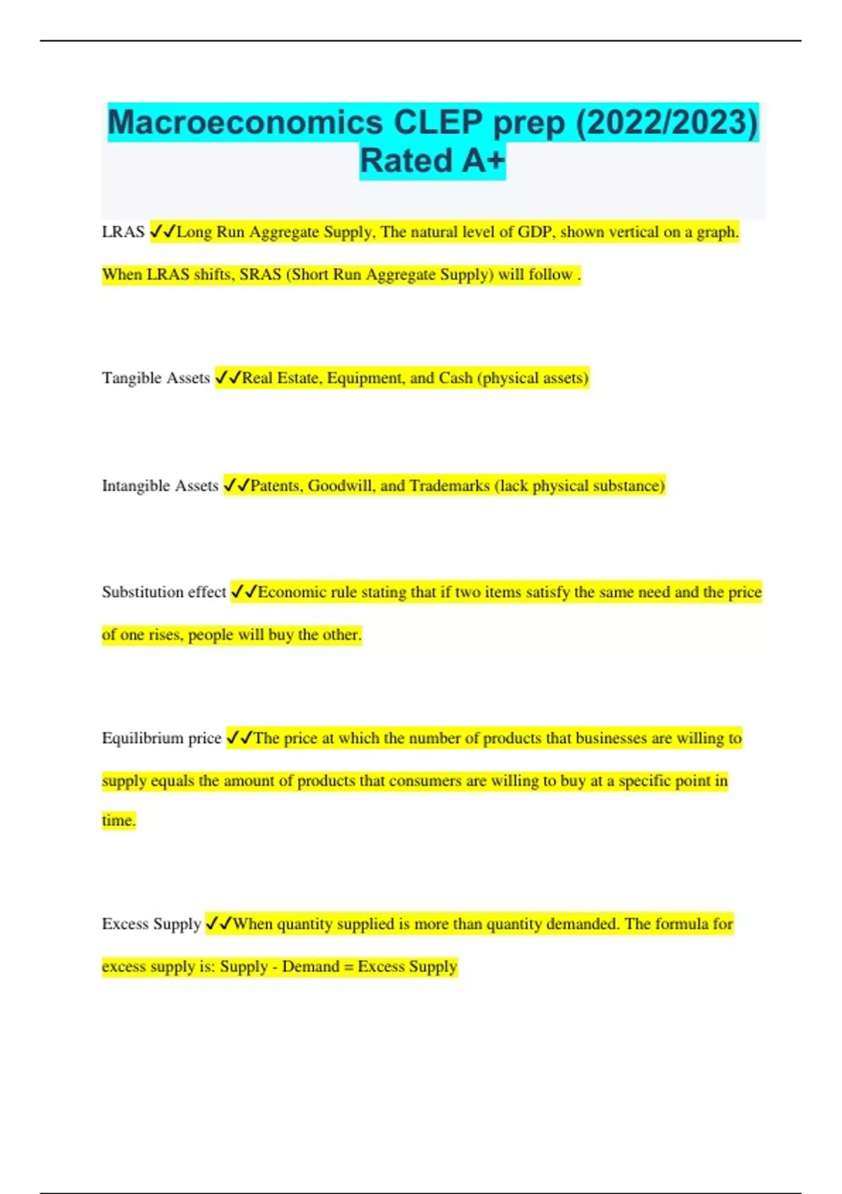 Macroeconomics CLEP prep (2022/2023) Rated A+ LRAS Long Run Aggregate Supply, The natural level of GDP, shown vertical on a graph. When LRAS shifts, SRAS (Short Run Aggregate Supply) will follow . Tangible Assets Real Estate, Equipment, and Cash (physical assets) Intangible Assets Patents, Goodwill, and Trademarks (lack physical substance) Substitution effect Economic rule stating that if two items satisfy the same need and the price of one rises, people will buy the other. Equilibrium price The price at which the number of products that businesses are willing to supply equals the amount of products that consumers are willing to buy at a specific point in time. Excess Supply When quantity supplied is more than quantity demanded. The formula for excess supply is: Supply - Demand = Excess Supply Reservation price Maximum price that a customer is willing to pay for a good Buyer's surplus The difference between a buyer's reservation price (the price they want to pay) and the actual price paid for a good or service Seller's surplus The difference between the price received by the seller and the seller's reservation price Total surplus The difference between the buyer's reservation price and the seller's reservation price. Consumer surplus + Producer surplus Free market A market with unrestricted trading of goods, where the prices of goods are determined by supply and demand. Traditional economic system In a traditional economic system, the availability of resources is based on inheritance. Goods are only produced for consumption and surpluses do not occur. This type of economy is normally found in South American, Asian, and African countries. Command economic system An economic system in which all factors of production are owned and controlled by the government. Often referred to as a centrally planned economic system. Example: Former Soviet Union. Mixed market Combines pure market and command. Example: Japan Law of Diminishing Marginal Utility A law stating that as a person consumes additional units of a good, eventually the utility gained from each additional unit of the good decreases. Law of Demand A law stating that as the price of a product increases the demand of that product decreases, while if the price of a product decreases the demand for that product increases. Law