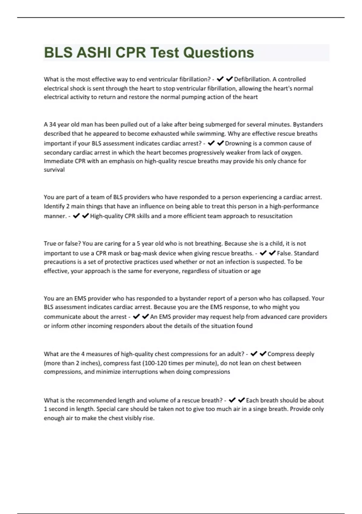 BLS ASHI CPR Test Questions Rated 100% Correct!!
