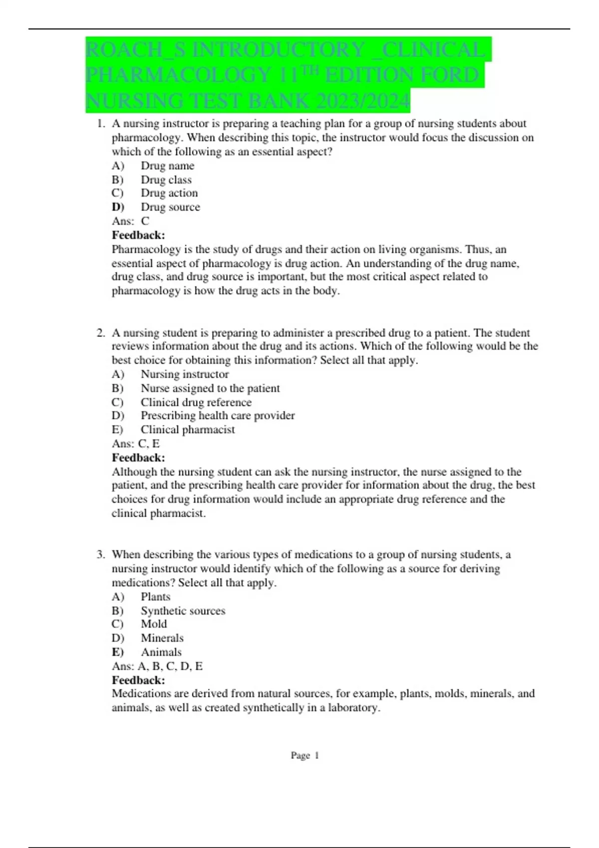 1. A nursing instructor is preparing a teaching plan for a group of nursing students about pharmacology. When describing this topic, the instructor would focus the discussion on which of the following as an essential aspect? A) Drug name B) Drug class C) Drug action D) Drug source Ans: C Feedback: Pharmacology is the study of drugs and their action on living organisms. Thus, an essential aspect of pharmacology is drug action. An understanding of the drug name, drug class, and drug source is important, but the most critical aspect related to pharmacology is how the drug acts in the body.
