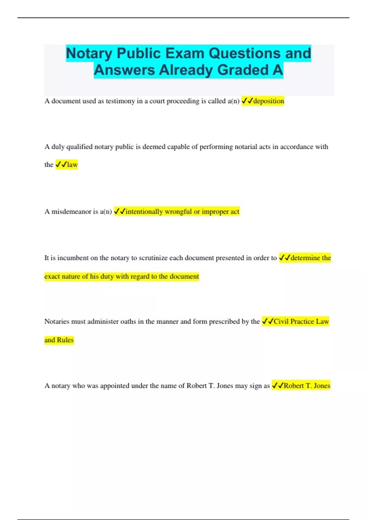 Notary Public Exam Questions and Answers Already Graded A A document used as testimony in a court proceeding is called a(n) deposition A duly qualified notary public is deemed capable of performing notarial acts in accordance with the law A misdemeanor is a(n) intentionally wrongful or improper act It is incumbent on the notary to scrutinize each document presented in order to determine the exact nature of his duty with regard to the document Notaries must administer oaths in the manner and form prescribed by the Civil Practice Law and Rules A notary who was appointed under the name of Robert T. Jones may sign as Robert T. Jones