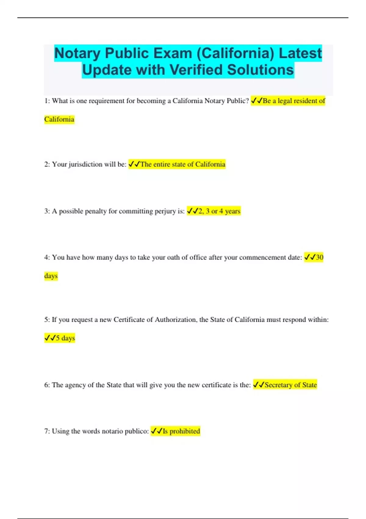 Notary Public Exam (California) Latest Update with Verified Solutions 1: What is one requirement for becoming a California Notary Public? Be a legal resident of California 2: Your jurisdiction will be: The entire state of California 3: A possible penalty for committing perjury is: 2, 3 or 4 years 4: You have how many days to take your oath of office after your commencement date: 30 days 5: If you request a new Certificate of Authorization, the State of California must respond within: 5 days 6: The agency of the State that will give you the new certificate is the: Secretary of State 7: Using the words notario publico: Is prohibited