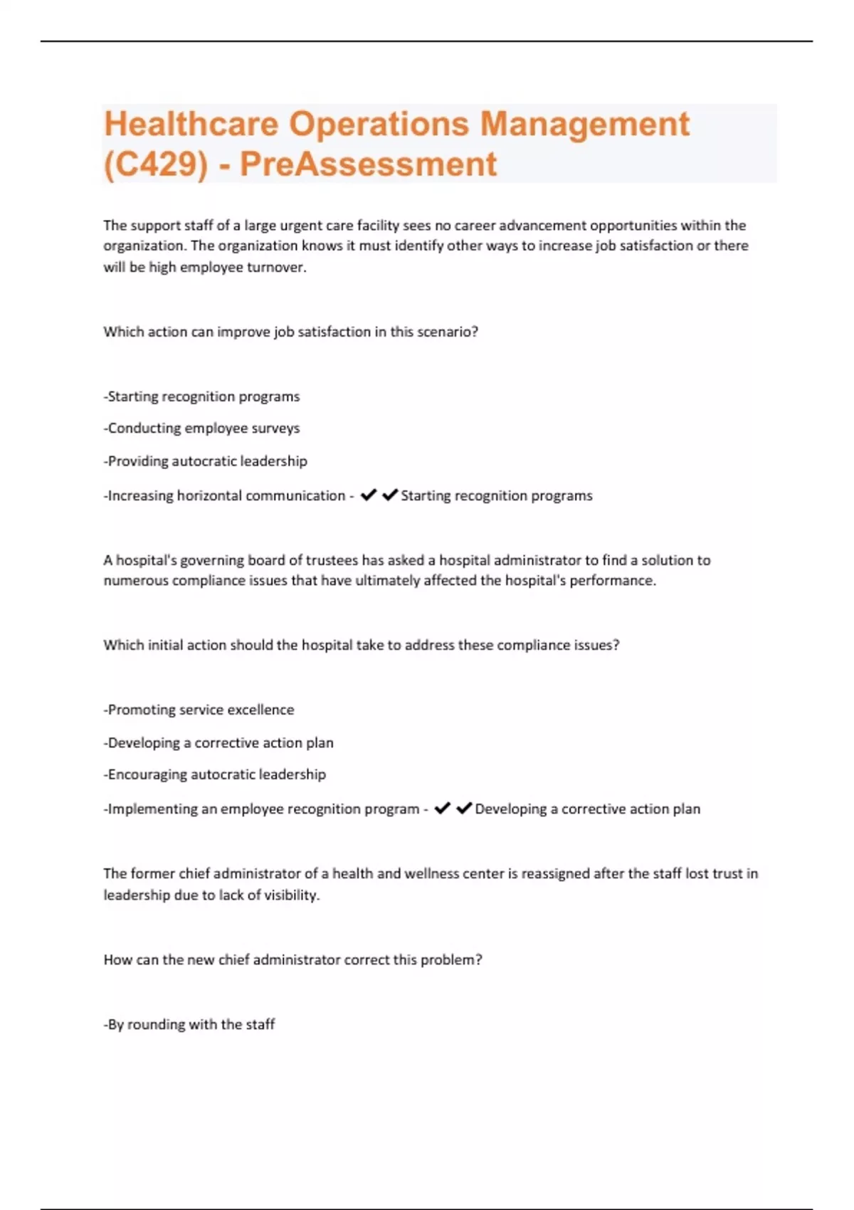Healthcare Operations Management (C429) - PreAssessment The support staff of a large urgent care facility sees no career advancement opportunities within the organization. The organization knows it must identify other ways to increase job satisfaction or there will be high employee turnover. Which action can improve job satisfaction in this scenario? -Starting recognition programs -Conducting employee surveys -Providing autocratic leadership -Increasing horizontal communication - Starting recognition programs A hospital's governing board of trustees has asked a hospital administrator to find a solution to numerous compliance issues that have ultimately affected the hospital's performance. Which initial action should the hospital take to address these compliance issues? -Promoting service excellence -Developing a corrective action plan -Encouraging autocratic leadership -Implementing an employee recognition program - Developing a corrective action plan The former chief administrator of a health and wellness center is reassigned after the staff lost trust in leadership due to lack of visibility. How can the new chief administrator correct this problem? -By rounding with the staff-By holding meetings with leadership -By implementing a non-monetary employee recognition program -By surveying the employees to determine unresolved problems - By rounding with the staff A hospital emergency room (ER) has had frequent turnover in nursing positions, which has caused increased wait times. The hospital must use new strategies to reduce employee turnover and decrease wait times. Which leadership strategy should be used? -Increasing patient to nurse ratios in the emergency room -Expanding the triage area space with an additional triage RN -Empowering human resources to hire from outside the organization -Empowering nurses to use holding areas for patients being admitted - Empowering nurses to use holding areas for patients being admitted A large healthcare system is currently implementing an initiative to reduce catheter-associated infections for its inpatients—not only for patient safety, but also as a strategy to ensure the organization is not penalized in its reimbursements. Which two practices will assist in the implementation of this initiative? Choose 2 answers-Engaging front line employees' feedback on current practices -Submitting a request for proposal (RFP) for a new catheter vendor -Evaluating previous financial impact to determine potential penalties -Providing mandatory training to help employees implement the protocols - Engaging front line employees' feedback on current practices Providing mandatory training to help employees implement the protocols A hospital leadership team is about to start its hospital-wide implementation of a Hospital Consumer Assessment of Healthcare Providers and Systems program and has discussed best practices that should be implemented based on a recent leadership seminar the team attended on the subject. Which strategy should be used to ensure successful implementation of the program? -Engaging with all stakeholders -Providing an informative web page -Educating volunteers on guidelines -Reviewing reports of similar facilities - Engaging with all stakeholders A well-established medical chain has discovered that infighting is taking place between its high-level leaders over boundaries and responsibilities. The chief executive officer (CEO) wishes to resolve the infighting. Which conflict resolution method should the CEO use to resolve this issue? -Forcing -Win-win-Compromise -Accommodation - Win-win A large healthcare organization is struggling and has decided it wishes to be a more innovative company. It decides to reorganize its structure to support this initiative. Which type of organizational structure will enhance creativity among its workers and managers? -Pyramid -Flattened -Functional -Geographical - Flattened The chief financial officer (CFO) of a hospital has received a HIPAA audit that has identified deficiencies in the medical/surgical nursing unit. Which strategy should the CFO and nursing director use to ensure that the department is compliant with HIPAA? -Provide HIPAA pamphlets to patients and their families -Ensure HIPAA consent forms are readily available -Have the staff read the policy for HIPAA on the unit -Conduct HIPAA training and testing for competency - Conduct HIPAA training and testing for competency A low-performing physician's office has struggled with new patient enrollment and is trying to increase its revenue. The physician is concerned about non-compliance with the Stark Law. Which action is of concern?-Releasing patient records to the family -Submitting claims for non-provided services -Receiving a finder's fee for Medicare referrals -Turning away a laboring patient for non-insurance - Receiving a finder's fee for Medicare referrals A large metropolitan hospital has implemented strategic measures including improvement of overall patient experience and survey scores. Leadership is seeking a measurement of the overall initiative. What will measure success or failure? -Hospital implementation of an electronic survey system -A patient satisfaction survey of hospitals in the local area -The American College of Emergency Physicians' satisfaction survey -The Hospital Consumer Assessment of Healthcare Providers and Systems survey - The Hospital Consumer Assessment of Healthcare Providers and Systems survey A hospital has recently implemented a continuous process improvement to decrease the length of stay for patients in the hospital. The plan will monitor the actual length of stay in comparison to the expected length of stay. What must the hospital use to monitor this process? -Internal validity of the provided data -Conflicting data from different sources -Researcher bias about self-reported data -Patient acuity data to establish the length of stay - Internal validity of the provided dataA community hospital board, consisting of physi