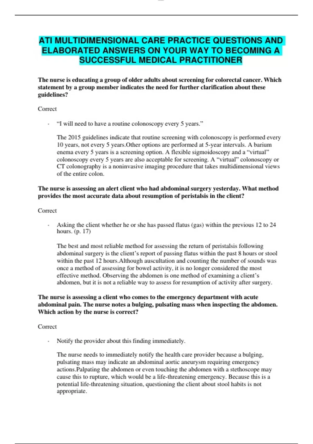 ATI MULTIDIMENSIONAL CARE PRACTICE QUESTIONS AND ELABORATED ANSWERS ON YOUR WAY TO BECOMING A SUCCESSFUL MEDICAL PRACTITIONER