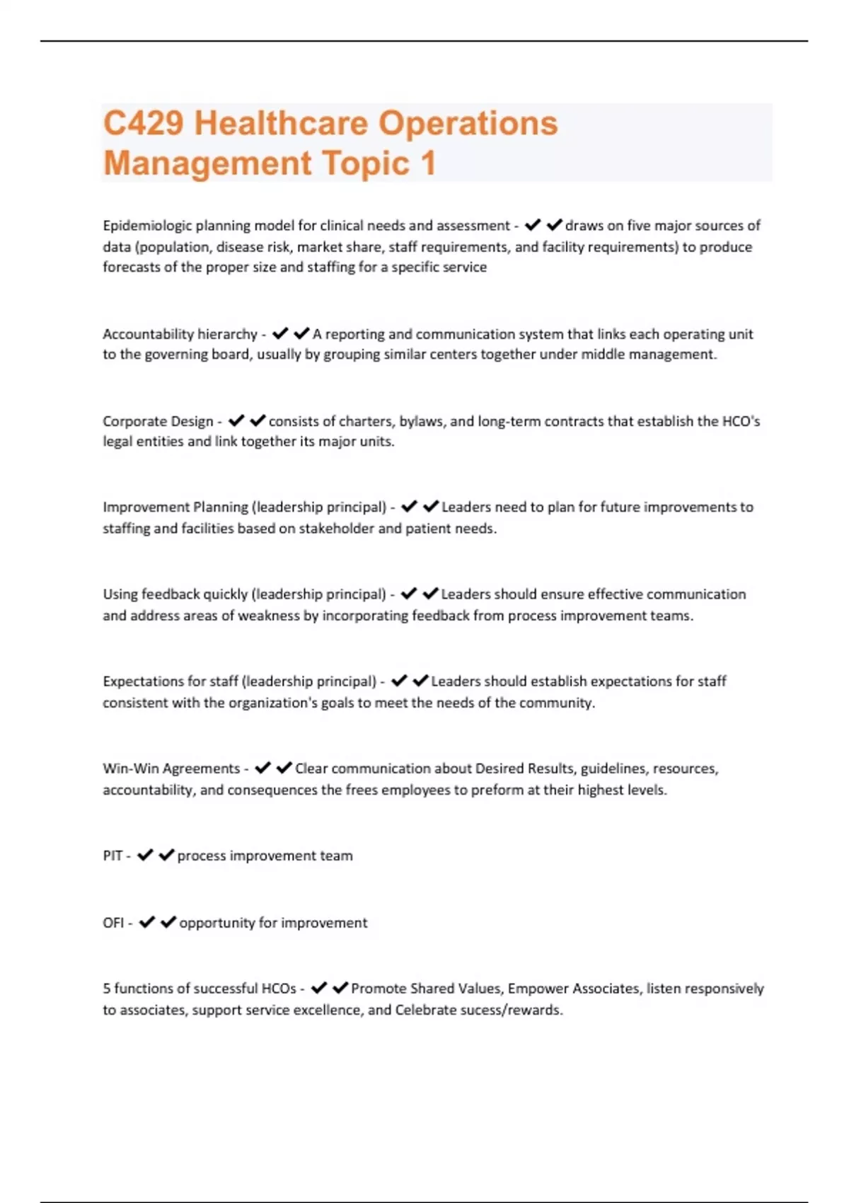 Epidemiologic planning model for clinical needs and assessment - draws on five major sources of data (population, disease risk, market share, staff requirements, and facility requirements) to produce forecasts of the proper size and staffing for a specific service Accountability hierarchy - A reporting and communication system that links each operating unit to the governing board, usually by grouping similar centers together under middle management. Corporate Design - consists of charters, bylaws, and long-term contracts that establish the HCO's legal entities and link together its major units. Improvement Planning (leadership principal) - Leaders need to plan for future improvements to staffing and facilities based on stakeholder and patient needs. Using feedback quickly (leadership principal) - Leaders should ensure effective communication and address areas of weakness by incorporating feedback from process improvement teams. Expectations for staff (leadership principal) - Leaders should establish expectations for staff consistent with the organization's goals to meet the needs of the community. Win-Win Agreements - Clear communication about Desired Results, guidelines, resources, accountability, and consequences the frees employees to preform at their highest levels. PIT - process improvement team OFI - opportunity for improvement 5 functions of successful HCOs - Promote Shared Values, Empower Associates, listen responsively to associates, support service excellence, and Celebrate sucess/rewards.Purpose of cultural leadership - to effectively implement transformational management of teams from the bedside to the boardroom and to sustain an environment where all associates are empowered and motivated to meet the customers needs.