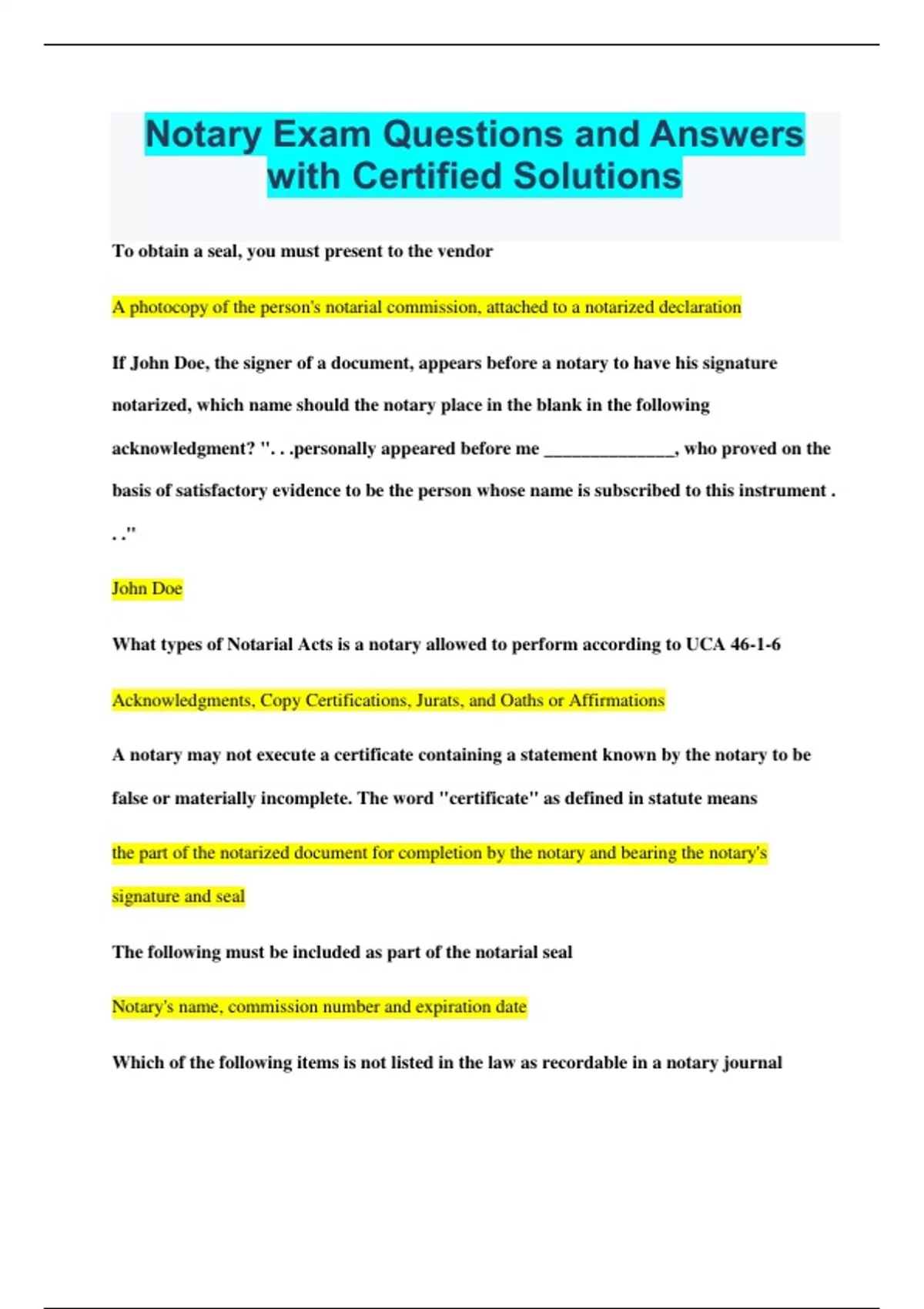 To obtain a seal, you must present to the vendor A photocopy of the person's notarial commission, attached to a notarized declaration If John Doe, the signer of a document, appears before a notary to have his signature notarized, which name should the notary place in the blank in the following acknowledgment? ". . .personally appeared before me ______________, who proved on the basis of satisfactory evidence to be the person whose name is subscribed to this instrument . . ." John Doe What types of Notarial Acts is a notary allowed to perform according to UCA 46-1-6 Acknowledgments, Copy Certifications, Jurats, and Oaths or Affirmations A notary may not execute a certificate containing a statement known by the notary to be false or materially incomplete. The word "certificate" as defined in statute means the part of the notarized document for completion by the notary and bearing the notary's signature and seal The following must be included as part of the notarial seal Notary's name, commission number and expiration date Which of the following items is not listed in the law as recordable in a notary journal