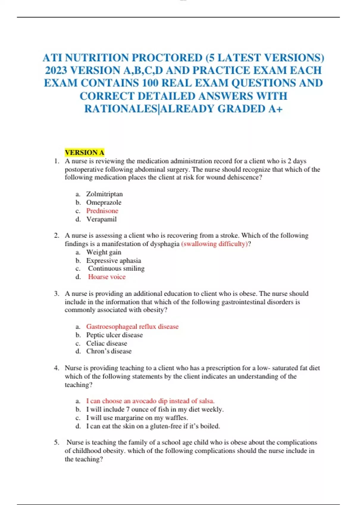 ATI NUTRITION PROCTORED (5 LATEST VERSIONS) 2023 VERSION A,B,C,D AND PRACTICE EXAM EACH EXAM CONTAINS 100 REAL EXAM QUESTIONS AND CORRECT DETAILED ANSWERS WITH RATIONALES|ALREADY GRADED A+