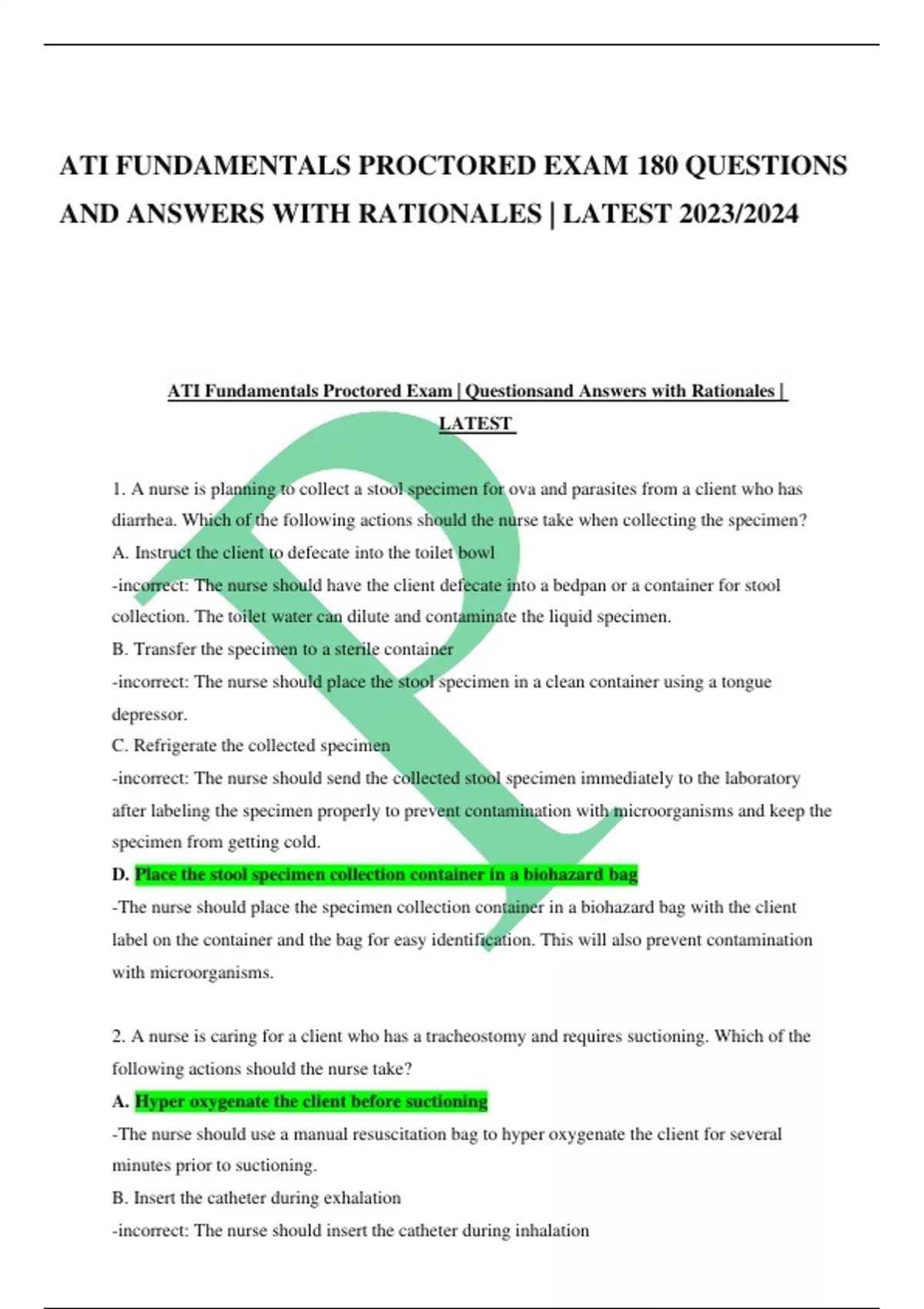 ATI FUNDAMENTALS PROCTORED EXAM 180 QUESTIONS AND ANSWERS WITH RATIONALES | LATEST 2023/2024