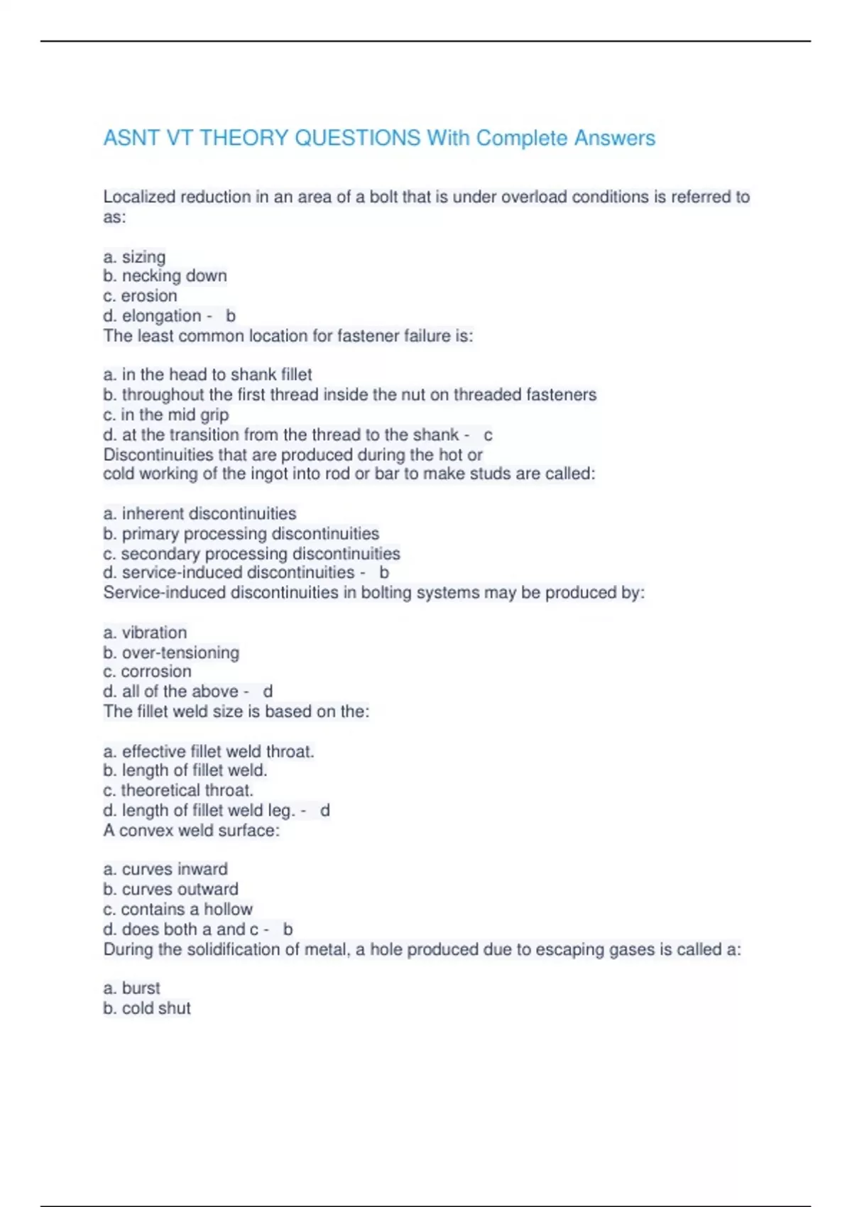 ASNT VT THEORY QUESTIONS With Complete Answers Localized reduction in an area of a bolt that is under overload conditions is referred to as: a. sizing b. necking down c. erosion d. elongation - b The least common location for fastener failure is: a. in the head to shank fillet b. throughout the first thread inside the nut on threaded fasteners c. in the mid grip d. at the transition from the thread to the shank - c Discontinuities that are produced during the hot or cold working of the ingot into rod or bar to make studs are called: a. inherent discontinuities b. primary processing discontinuities c. secondary processing discontinuities d. service-induced discontinuities - b Service-induced discontinuities in bolting systems may be produced by: a. vibration b. over-tensioning c. corrosion d. all of the above - d The fillet weld size is based on the: a. effective fillet weld throat. b. length of fillet weld. c. theoretical throat. d. length of fillet weld leg. - d A convex weld surface: a. curves inward b. curves outward c. contains a hollow d. does both a and c - b During the solidification of metal, a hole produced due to escaping gases is called a: a. burst b. cold shut c. flaking d. blow hole - d Weldments might contain: a. shrinkage b. incomplete penetration c seams d laps - b A discontinuity typically found in forgings is: a. shrinkage b. bleed-out c laps d undercut - c Embrittlement, caused by a physical or chemical change in the metal, is a reduction in: a. ductility b. hardness c. hydrogen d. all of the above - a The deterioration of a metal by chemical or electrochemical reaction with its environment is called: a. corrosion. b. erosion. c. IGSCC. d. none of the above. - a The roughest surface finish is indicated by a measurement of: a. 64 µin. b. 150 µin. c. 250 µin. d. 380 µin. - d A basic metallurgical joint configuration that is used for complete joint penetration is called: a butt joint. b. a fillet joint. c. a lap joint. d. none of the above. - a The welding process that is sometimes referred to as "stick welding" is: a. SAW b. SMAW c. GMAW d. GTAW - b The welding process in which there is a higher degree of probability of entrapping slag is: a. GMAW b. GTAW c. SMAW d. all of the above - c Tungsten inclusions arc found during: a. GMAW. b. GTAW. c. SMAW. d. none of the above. - b The portion of base metal that has not been melted but where mechanical properties or microstructure have been altered by the heat of welding is defined as: a. the fusion zone. b. the heat-affected zone. c. both a and b above. d. none of the above. - b The difference between discontinuities and defects is that: a. a defect is a rejectable discontinuity. b. discontinuities affect the base metal, whereas defects affect the weld metal c. there should be no distinction between discontinuities and defects. d. a discontinuity is a rejectable defect. - a The gage that provides measurements of internal misalignment on 76 mm (3 in.) diameter pipe is: a. a Cambridge gage. b. a fillet weld gage. c. a hi-lo welding gage d. both a and b - c In a bore scope, the image is brought to the eyepiece by: a. an objective lens. b. relay lenses. c. an eyepiece lens. d. all of the above. - d In welding, temperature indicating sticks are used to monitor: a. preheat temperatures. b. post heat temperatures. c. interpass temperatures. d. all of the above. - d To measure the diameter of a 76 mm (3 in) stud most accurately, use a: a. 51-76 mm (2-3 in.) inside mechanical gage (micrometer). b. outside caliper. c. 152 mm (6 in.) dial caliper. d. mechanical (micrometer) depth gage. - c A discontinuity that appears as a series of re-melted dots beside a weld, resembling a trail left in striking a match is called: a. linear porosity. b. arc strikes. c. undercut d. slag. - b A protrusion or rollover of weld metal beyond the toe or root is called: a. overlap. b. undercut. c. reinforcement. d. overfill - a