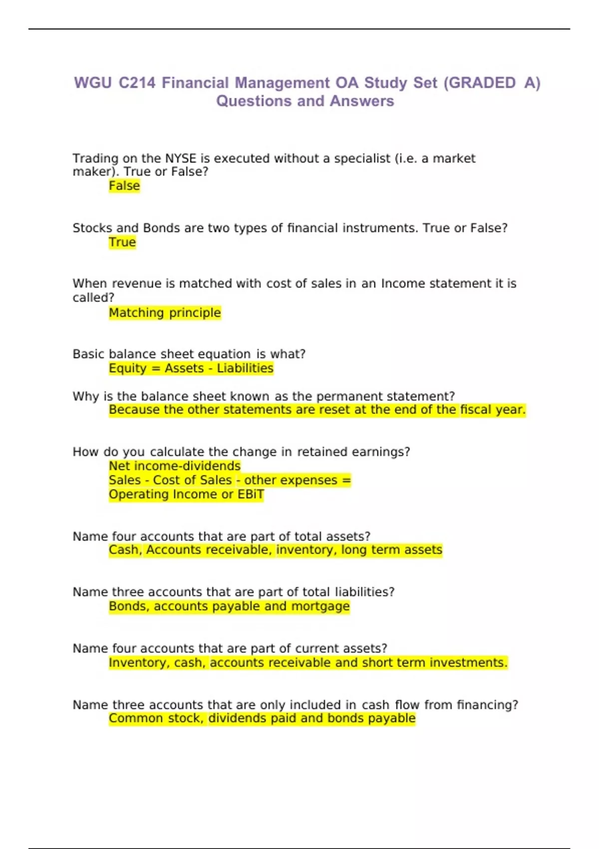 WGU C214 OA Financial Management Practice Test Questions and Answers (2022/2023) GRADED A+
