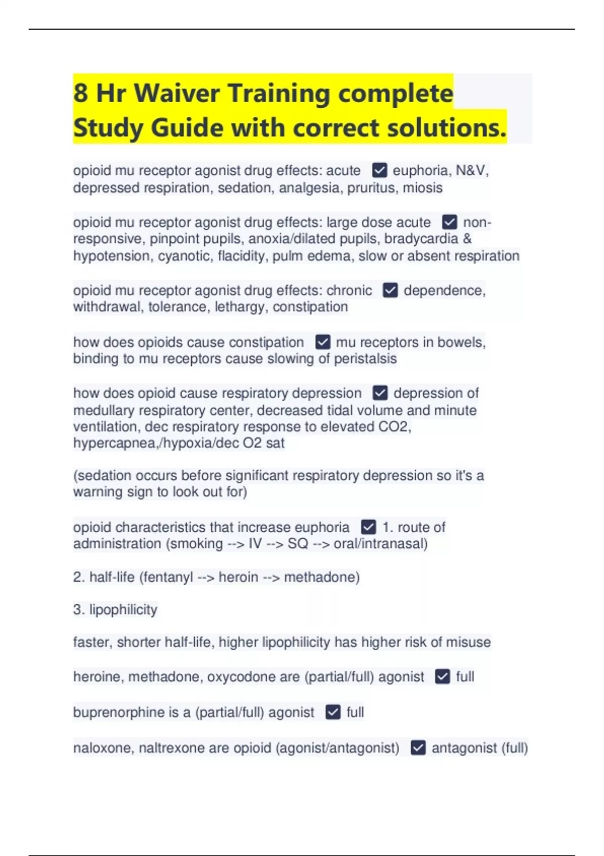 8 Hr Waiver Training complete Study Guide with correct solutions | Latest 2023/2024 opioid mu receptor agonist drug effects: acute ☑️ euphoria, N&V, depressed respiration, sedation, analgesia, pruritus, miosis opioid mu receptor agonist drug effects: large dose acute ☑️ nonresponsive, pinpoint pupils, anoxia/dilated pupils, bradycardia & hypotension, cyanotic, flacidity, pulm edema, slow or absent respiration opioid mu receptor agonist drug effects: chronic ☑️ dependence, withdrawal, tolerance, lethargy, constipation how does opioids cause constipation ☑️ mu receptors in bowels, binding to mu receptors cause slowing of peristalsis how does opioid cause respiratory depression ☑️ depression of medullary respiratory center, decreased tidal volume and minute ventilation, dec respiratory response to elevated CO2, hypercapnea,/hypoxia/dec O2 sat (sedation occurs before significant respiratory depression so it's a warning sign to look out for) opioid characteristics that increase euphoria ☑️ 1. route of administration (smoking --> IV --> SQ --> oral/intranasal) 2. half-life (fentanyl --> heroin --> methadone) 3. lipophilicity faster, shorter half-life, higher lipophilicity has higher risk of misuse heroine, methadone, oxycodone are (partial/full) agonist ☑️ full buprenorphine is a (partial/full) agonist ☑️ full naloxone, naltrexone are opioid (agonist/antagonist) ☑️ antagonist (full)