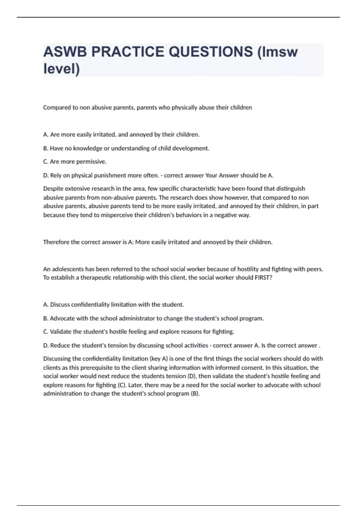 ASWB PRACTICE QUESTIONS (lmsw level)