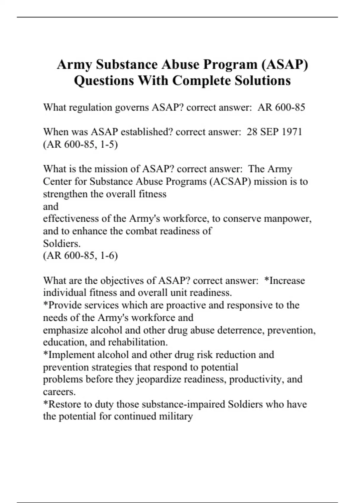 Army Substance Abuse Program (ASAP) Questions With Complete Solutions