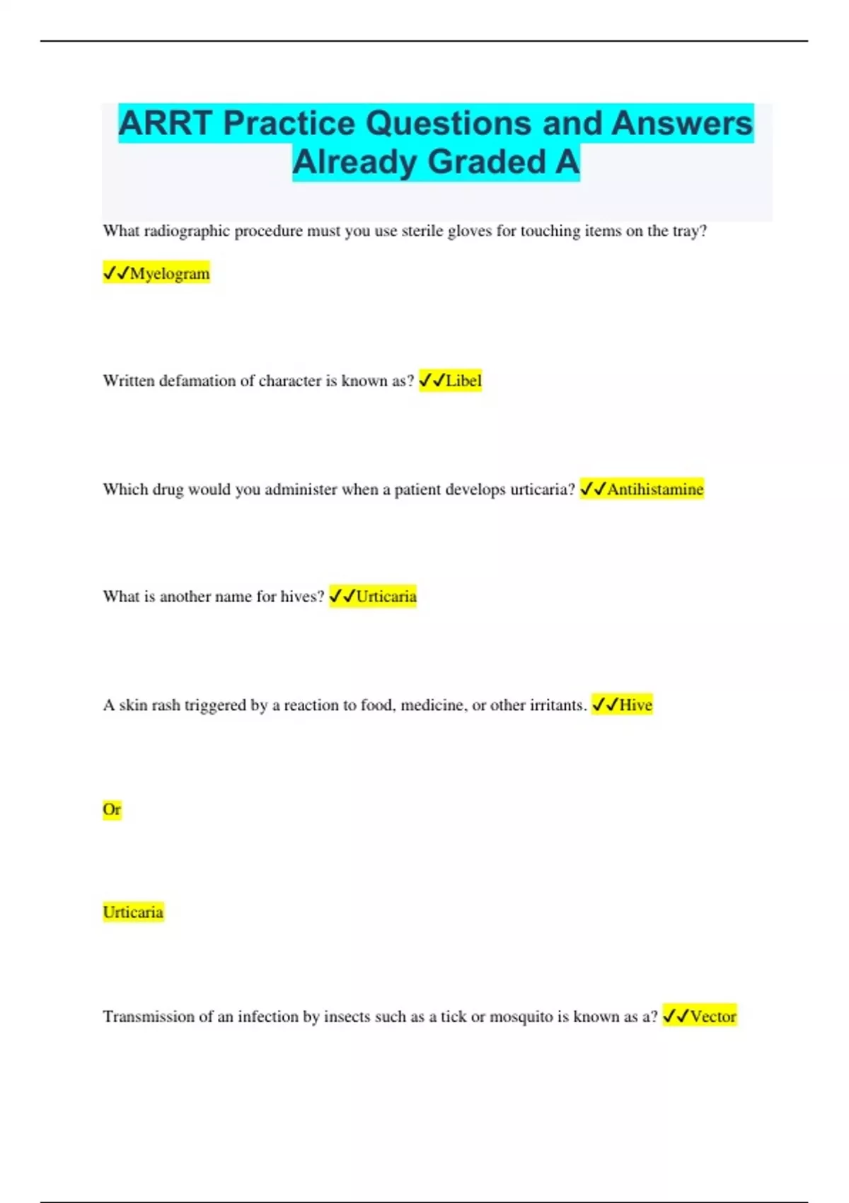 What radiographic procedure must you use sterile gloves for touching items on the tray? Myelogram Written defamation of character is known as? Libel Which drug would you administer when a patient develops urticaria? Antihistamine