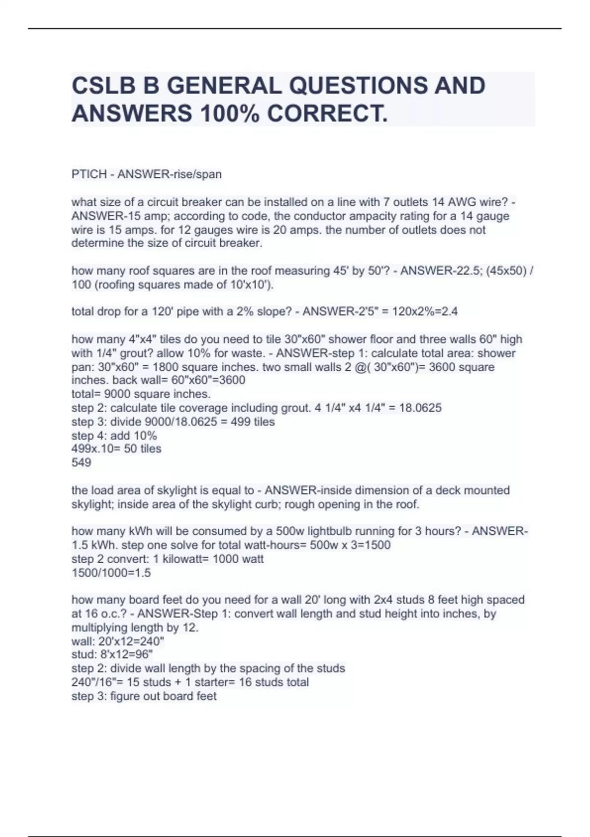 PTICH - ANSWER-rise/span what size of a circuit breaker can be installed on a line with 7 outlets 14 AWG wire? - ANSWER-15 amp; according to code, the conductor ampacity rating for a 14 gauge wire is 15 amps. for 12 gauges wire is 20 amps. the number of outlets does not determine the size of circuit breaker. how many roof squares are in the roof measuring 45' by 50'? - ANSWER-22.5; (45x50) / 100 (roofing squares made of 10'x10'). total drop for a 120' pipe with a 2% slope? - ANSWER-2'5" = 120x2%=2.4 how many 4"x4" tiles do you need to tile 30"x60" shower floor and three walls 60" high with 1/4" grout? allow 10% for waste. - ANSWER-step 1: calculate total area: shower pan: 30"x60" = 1800 square inches. two small walls 2 @( 30"x60")= 3600 square inches. back wall= 60"x60"=3600 total= 9000 square inches. step 2: calculate tile coverage including grout. 4 1/4" x4 1/4" = 18.0625 step 3: divide 9000/18.0625 = 499 tiles step 4: add 10% 499x.10= 50 tiles 549 the load area of skylight is equal to - ANSWER-inside dimension of a deck mounted skylight; inside area of the skylight curb; rough opening in the roof. how many kWh will be consumed by a 500w lightbulb running for 3 hours? - ANSWER-1.5 kWh. step one solve for total watt-hours= 500w x 3=1500