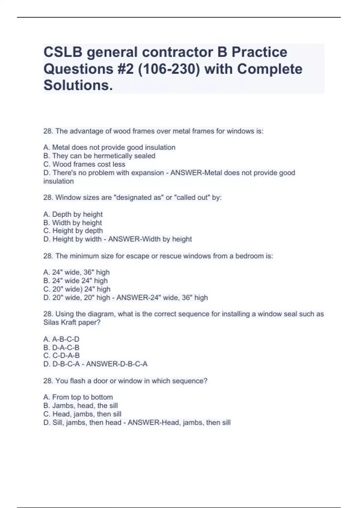 28. The advantage of wood frames over metal frames for windows is: A. Metal does not provide good insulation B. They can be hermetically sealed C. Wood frames cost less D. There's no problem with expansion - ANSWER-Metal does not provide good insulation 28. Window sizes are "designated as" or "called out" by: A. Depth by height B. Width by height C. Height by depth D. Height by width - ANSWER-Width by height 28. The minimum size for escape or rescue windows from a bedroom is: A. 24" wide, 36" high B. 24" wide 24" high C. 20" wide) 24" high D. 20" wide, 20" high - ANSWER-24" wide, 36" high 28. Using the diagram, what is the correct sequence for installing a window seal such as Silas Kraft paper? A. A-B-C-D B. D-A-C-B C. C-D-A-B D. D-B-C-A - ANSWER-D-B-C-A
