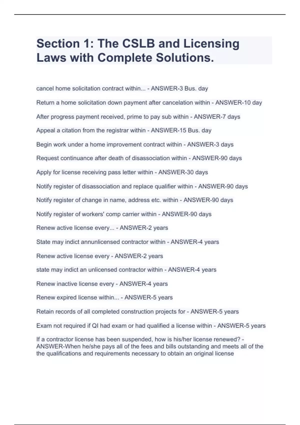 Section 1: The CSLB and Licensing Laws with Complete Solutions.