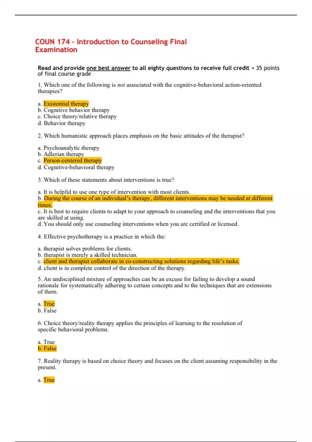 COUN 174 – Introduction to Counseling Final Examination