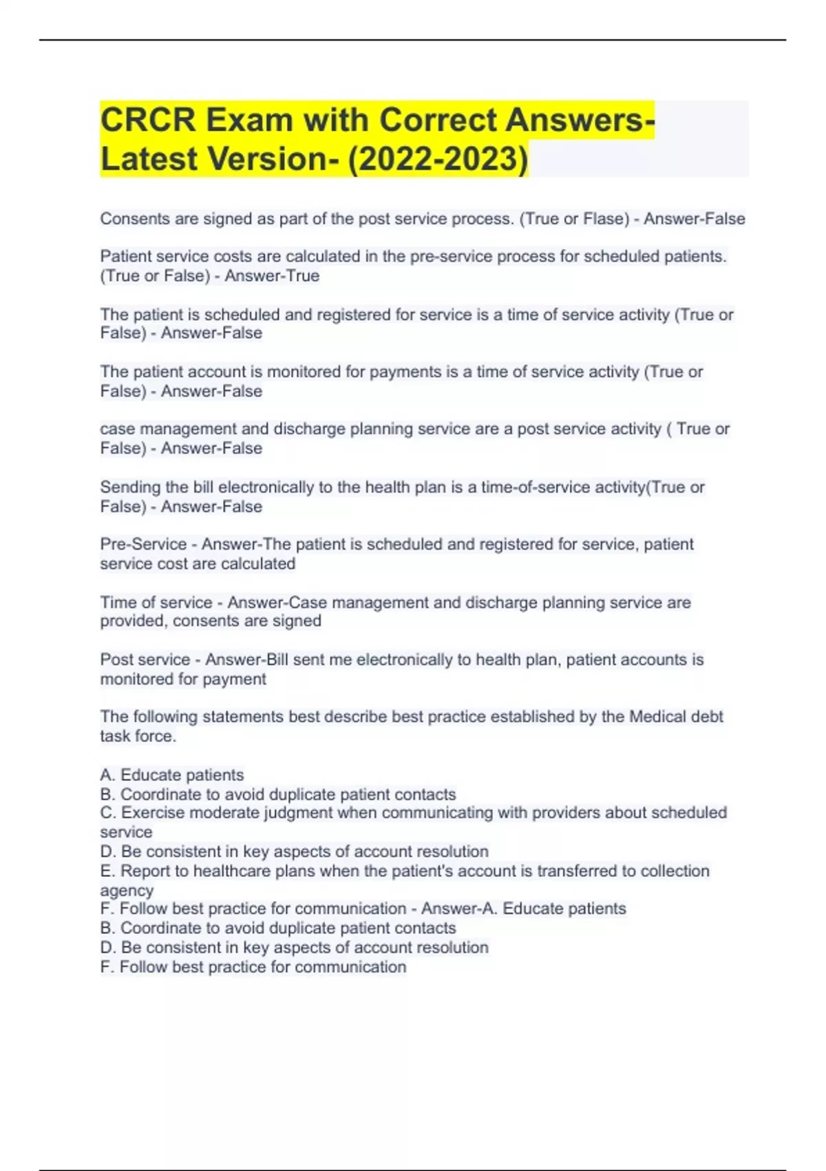 Consents are signed as part of the post service process. (True or Flase) - Answer-False Patient service costs are calculated in the pre-service process for scheduled patients.(True or False) - Answer-True The patient is scheduled and registered for service is a time of service activity (True or False) - Answer-False The patient account is monitored for payments is a time of service activity (True or False) - Answer-False case management and discharge planning service are a post service activity ( True or False) - Answer-False Sending the bill electronically to the health plan is a time-of-service activity(True or False) - Answer-False Pre-Service - Answer-The patient is scheduled and registered for service, patient service cost are calculated Time of service - Answer-Case management and discharge planning service are provided, consents are signed Post service - Answer-Bill sent me electronically to health plan, patient accounts is monitored for payment The following statements best describe best practice established by the Medical debt task force. A. Educate patients B. Coordinate to avoid duplicate patient contacts C. Exercise moderate judgment when communicating with providers about scheduled service D. Be consistent in key aspects of account resolution E. Report to healthcare plans when the patient's account is transferred to collection agency F. Follow best practice for communication - Answer-A. Educate patients B. Coordinate to avoid duplicate patient contacts D. Be consistent in key aspects of account resolution F. Follow best practice for communication