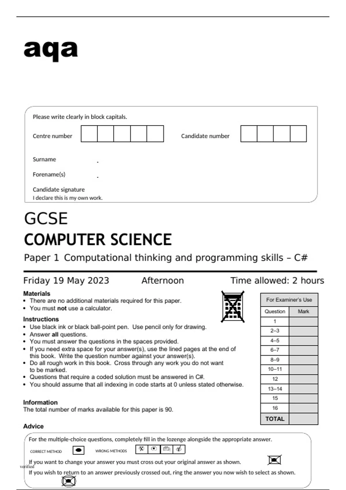 Aqa GCSE Computer Science 8525/1A Question Paper May2023.