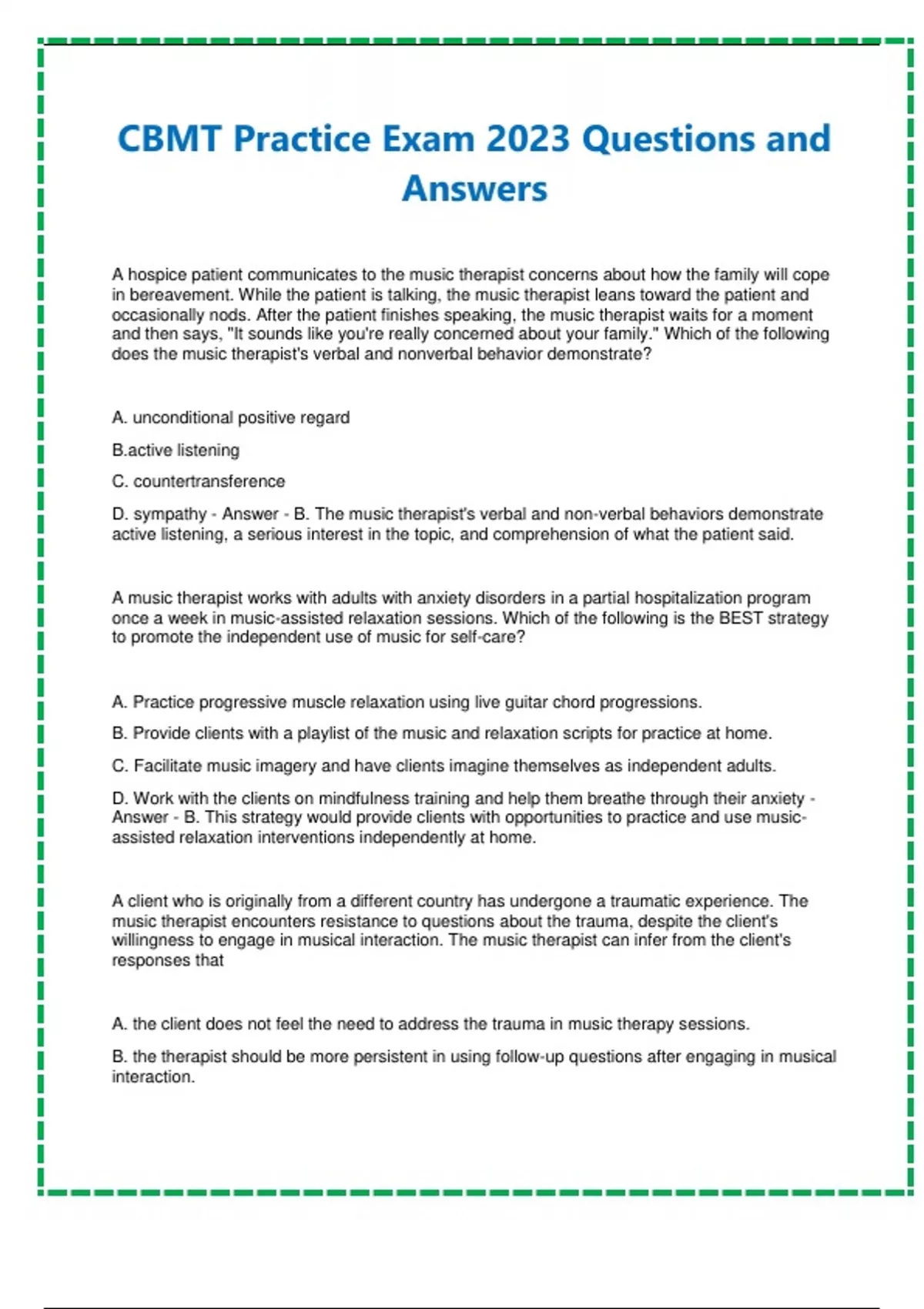 CBMT Practice Exam 2023 Questions and Answers A hospice patient communicates to the music therapist concerns about how the family will cope in bereavement. While the patient is talking, the music therapist leans toward the patient and occasionally nods. After the patient finishes speaking, the music therapist waits for a moment and then says, "It sounds like you're really concerned about your family." Which of the following does the music therapist's verbal and nonverbal behavior demonstrate? A. unconditional positive regard B.active listening C. countertransference D. sympathy - Answer - B. The music therapist's verbal and non-verbal behaviors demonstrate active listening, a serious interest in the topic, and comprehension of what the patient said. A music therapist works with adults with anxiety disorders in a partial hospitalization program once a week in music-assisted relaxation sessions. Which of the following is the BEST strategy to promote the independent use of music for self-care? A. Practice progressive muscle relaxation using live guitar chord progressions. B. Provide clients with a playlist of the music and relaxation scripts for practice at home. C. Facilitate music imagery and have clients imagine themselves as independent adults. D. Work with the clients on mindfulness training and help them breathe through their anxiety - Answer - B. This strategy would provide clients with opportunities to practice and use music-assisted relaxation interventions independently at home. A client who is originally from a different country has undergone a traumatic experience. The music therapist encounters resistance to questions about the trauma, despite the client's willingness to engage in musical interaction. The music therapist can infer from the client's responses that A. the client does not feel the need to address the trauma in music therapy sessions. B. the therapist should be more persistent in using follow-up questions after engaging in musical interaction. C.the client's cultural group may have a different perspective regarding questions of a personal nature. D. the client may have doubts about the music therapist's ability to address the trauma. - Answer - C. Cultural value systems are different, especially when comparing Western vs. Eastern cultures, and the music therapist's own values may not be the same as the client's. The therapist should acknowledge this bias and consider that cultural differences may limit their interpretation of the client's response. Especially if the client is from an Eastern culture, directness or assertiveness may not be understood or appreciated. A music therapist has been asked to write a song to help an adult with intellectual disabilities remember the steps involved with teeth brushing. The MOST effective song lyrics to promote functional independence includes