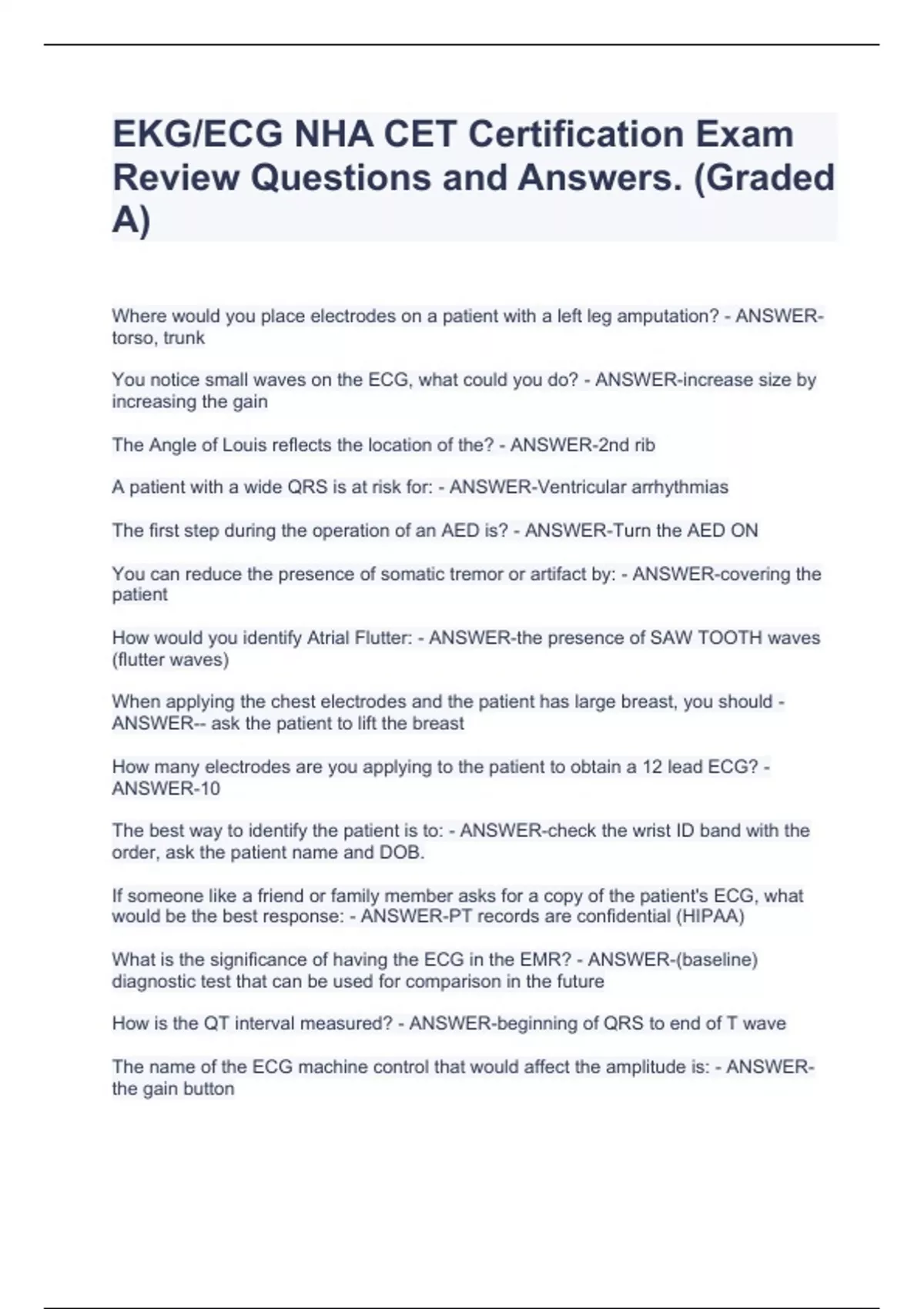 Where would you place electrodes on a patient with a left leg amputation? - ANSWER-torso, trunk You notice small waves on the ECG, what could you do? - ANSWER-increase size by increasing the gain The Angle of Louis reflects the location of the? - ANSWER-2nd rib A patient with a wide QRS is at risk for: - ANSWER-Ventricular arrhythmias The first step during the operation of an AED is? - ANSWER-Turn the AED ON You can reduce the presence of somatic tremor or artifact by: - ANSWER-covering the patient How would you identify Atrial Flutter: - ANSWER-the presence of SAW TOOTH waves (flutter waves) When applying the chest electrodes and the patient has large breast, you should - ANSWER-- ask the patient to lift the breast How many electrodes are you applying to the patient to obtain a 12 lead ECG? - ANSWER-10 The best way to identify the patient is to: - ANSWER-check the wrist ID band with the order, ask the patient name and DOB. If someone like a friend or family member asks for a copy of the patient's ECG, what would be the best response: - ANSWER-PT records are confidential (HIPAA)