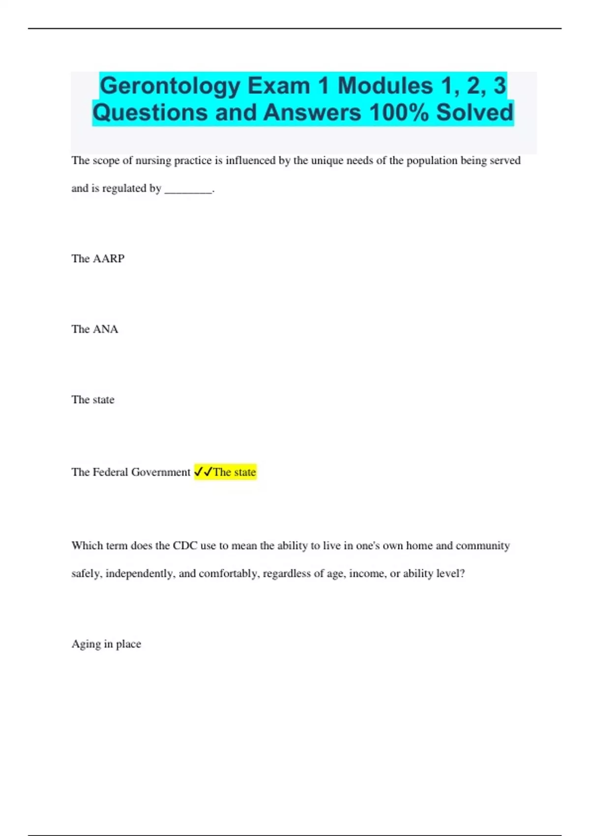 Gerontology Exam 1 Modules 1, 2, 3 Questions and Answers 100% Solved The scope of nursing practice is influenced by the unique needs of the population being served and is regulated by ________. The AARP The ANA The state The Federal Government The state Which term does the CDC use to mean the ability to live in one's own home and community safely, independently, and comfortably, regardless of age, income, or ability level? Aging in place Househole elderly Assisted living Freedom Aging in place Which initiative substantially increased the number of gerontological nurse scientists and the development of evidence-based gerontological nursing practice? STTI GNLA HGNI AARP HGNI A scientist who believes that people have a genetically programmed aging code that influences longevity is a supporter of which theory? Programmed theory Neuroendocrine theory Immunologic/autoimmune theory Gene/biological clock theory Gene/biological clock theory One often-forgotten group of the elderly in the United States is the prison population. Substandard environment, nutrition, exercise, and medical care during incarceration likely helps to________, as does the violence, anxiety, and stress associated with prison life. Reinforce social strictures against committing crimes Prevent repeat offenses Extend the