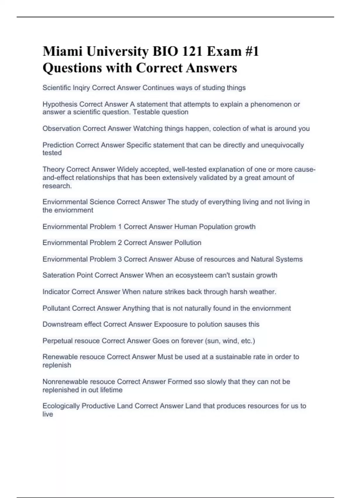 Scientific Inqiry Correct Answer Continues ways of studing things Hypothesis Correct Answer A statement that attempts to explain a phenomenon or answer a scientific question. Testable question Observation Correct Answer Watching things happen, colection of what is around you Prediction Correct Answer Specific statement that can be directly and unequivocally tested Theory Correct Answer Widely accepted, well-tested explanation of one or more cause-and-effect relationships that has been extensively validated by a great amount of research. Enviornmental Science Correct Answer The study of everything living and not living in the enviornment Enviornmental Problem 1 Correct Answer Human Population growth Enviornmental Problem 2 Correct Answer Pollution Enviornmental Problem 3 Correct Answer Abuse of resources and Natural Systems Sateration Point Correct Answer When an ecosysteem can't sustain growth Indicator Correct Answer When nature strikes back through harsh weather. Pollutant Correct Answer Anything that is not naturally found in the enviornment Downstream effect Correct Answer Expoosure to polution sauses this Perpetual resouce Correct Answer Goes on forever (sun, wind, etc.) Renewable resouce Correct Answer Must be used at a sustainable rate in order to replenish Nonrenewable resouce Correct Answer Formed sso slowly that they can not be replenished in out lifetime Ecologically Productive Land Correct Answer Land that produces resources for us to live