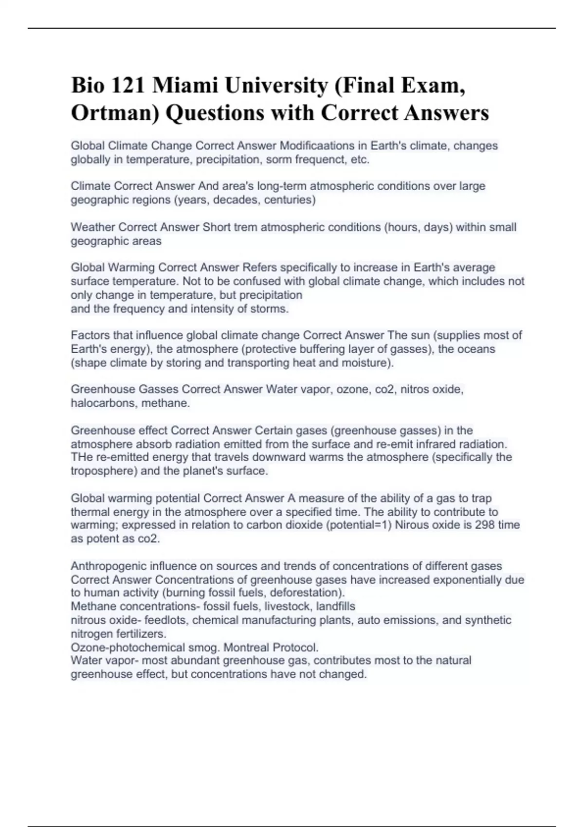 Global Climate Change Correct Answer Modificaations in Earth's climate, changes globally in temperature, precipitation, sorm frequenct, etc. Climate Correct Answer And area's long-term atmospheric conditions over large geographic regions (years, decades, centuries) Weather Correct Answer Short trem atmospheric conditions (hours, days) within small geographic areas Global Warming Correct Answer Refers specifically to increase in Earth's average surface temperature. Not to be confused with global climate change, which includes not only change in temperature, but precipitation and the frequency and intensity of storms. Factors that influence global climate change Correct Answer The sun (supplies most of Earth's energy), the atmosphere (protective buffering layer of gasses), the oceans (shape climate by storing and transporting heat and moisture). Greenhouse Gasses Correct Answer Water vapor, ozone, co2, nitros oxide, halocarbons, methane. Greenhouse effect Correct Answer Certain gases (greenhouse gasses) in the atmosphere absorb radiation emitted from the surface and re-emit infrared radiation. THe re-emitted energy that travels downward warms the atmosphere (specifically the troposphere) and the planet's surface. Global warming potential Correct Answer A measure of the ability of a gas to trap thermal energy in the atmosphere over a specified time. The ability to contribute to warming; expressed in relation to carbon dioxide (potential=1) Nirous oxide is 298 time as potent as co2. Anthropogenic influence on sources and trends of concentrations of different gases Correct Answer Concentrations of greenhouse gases have increased exponentially due to human activity (burning fossil fuels, deforestation). Methane concentrations- fossil fuels, livestock, landfills nitrous oxide- feedlots, chemical manufacturing plants, auto emissions, and synthetic nitrogen fertilizers. Ozone-photochemical smog. Montreal Protocol. Water vapor- most abundant greenhouse gas, contributes most to the natural greenhouse effect, but concentrations have not changed.