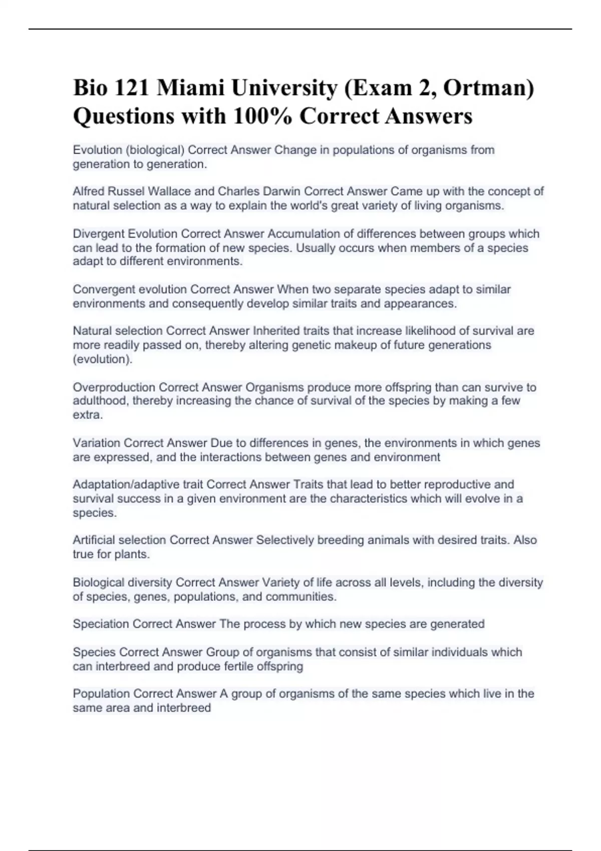 Bio 121 Miami University (Exam 2, Ortman) Questions with 100% Correct Answers