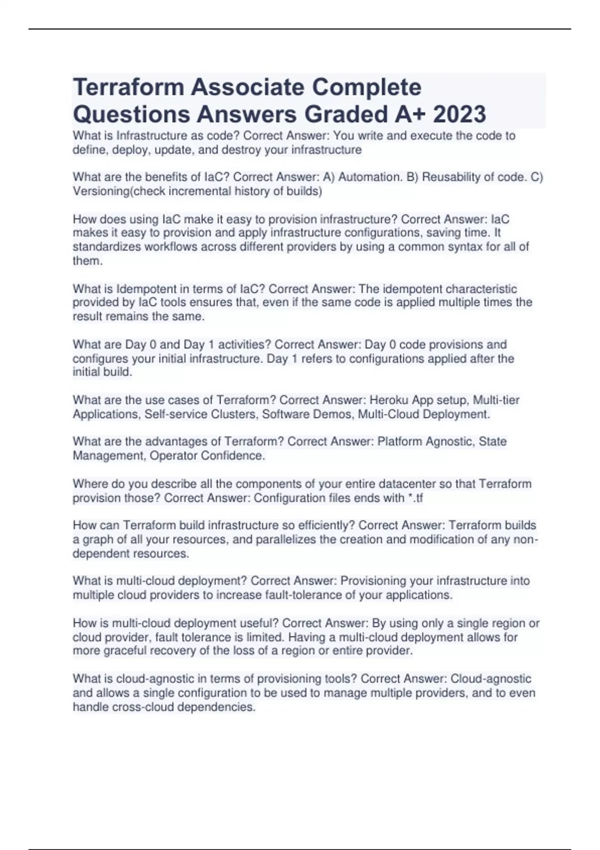 Terraform Associate Complete Questions Answers Graded A+ 2023 What is Infrastructure as code? Correct Answer: You write and execute the code to define, deploy, update, and destroy your infrastructure What are the benefits of IaC? Correct Answer: A) Automation. B) Reusability of code. C) Versioning(check incremental history of builds) How does using IaC make it easy to provision infrastructure? Correct Answer: IaC makes it easy to provision and apply infrastructure configurations, saving time. It standardizes workflows across different providers by using a common syntax for all of them.