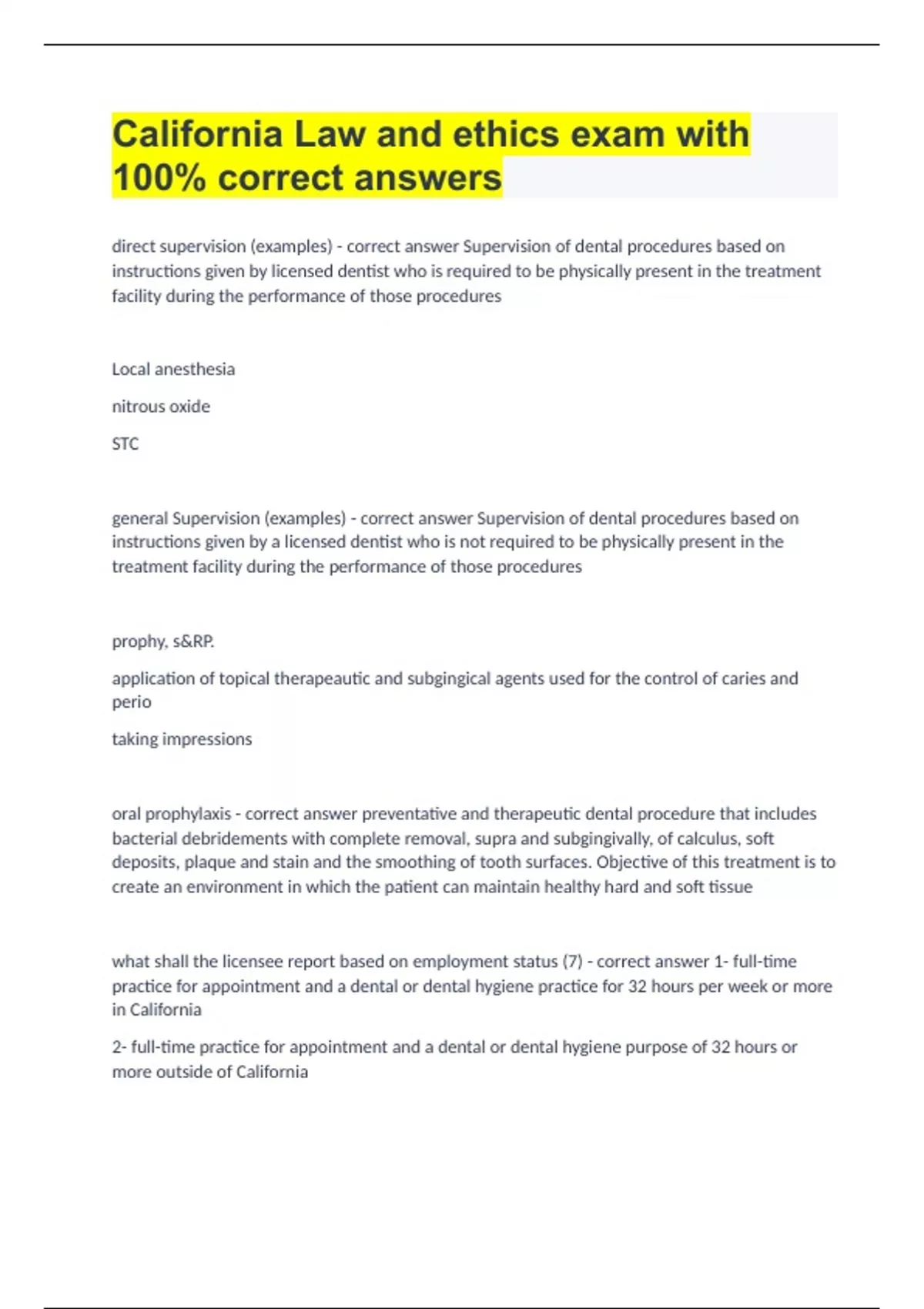 direct supervision (examples) Supervision of dental procedures based on instructions given by licensed dentist who is required to be physically present in the treatment facility during the performance of those procedures Local anesthesia nitrous oxide STC general Supervision (examples) Supervision of dental procedures based on instructions given by a licensed dentist who is not required to be physically present in the treatment facility during the performance of those procedures prophy, s&RP. application of topical therapeautic and subgingical agents used for the control of caries and perio taking impressions oral prophylaxis preventative and therapeutic dental procedure that includes bacterial debridements with complete removal, supra and subgingivally, of calculus, soft deposits, plaque and stain and the smoothing of tooth surfaces. Objective of this treatment is to create an environment in which the patient can maintain healthy hard and soft tissue what shall the licensee report based on employment status (7) 1- full-time practice for appointment and a dental or dental hygiene practice for 32 hours per week or more in California 2- full-time practice for appointment and a dental or dental hygiene purpose of 32 hours or more outside of California 3- part time practice or appointment and they dental or dental hygiene practice for less than 32 hours per week in California 4- part time practice or appointment and a dental or dental hygiene practice for less than 32 hours per week outside of California 5- dental hygiene administrative employment that does not include direct patient care as may be further defined by the committee 6- retired 7- other practice or employment status as may be further defined by the committee What are the committees functions? Verify licensing education discipline diversions and make laws t or f: All functions that may be performed by a RDA are able to be performed by a RDH f: all RDH registered prior to dec. 31, 2005 can perform all RDA functions all RDH registered on or after jan. 1, 2006 must qualify and receive RDA license to fulfill duties What functions can a RDH practice ADPIE: Assessment development planning implementation education counseling and screening what are some functions a RDH can not practice Signals and comprehensive treatment planning Placing, convincing, carving, or removal of permanent restorations Surgery or cutting on hard and soft tissue including but not limited to the removal of teeth and the cutting and suturing of soft tissue Prescribing medication Administering local or general anesthesia or oral or parental conscious sedation, except for the administration of nitrous oxide and oxygen, whether administration alone or in combination with each other, or local anesthesia pursuant to section t or f: the state of California. Dental hygienist and determine what radiographs to perform on a patient who has not received an initial examination by the supervising dentist for the specific purpose of the dentist making a diagnosis or treatment plan for the patient t RDH can only determine what radiographs to perform before and I examination by dentist in what circumstances If they're in a dental office setting for the public health setting for the purpose of communication with supervising dentist what are some services that a RDH can provide without direct supervision Educational services, oral health training programs, oral health screening When can a dental hygienist provide services such as fluoride or sealants without the direct supervision of a Dentist can they charge out the fluoride and sealants services In any public health program created by federal, state, or local law or administered by a federal, state, county or local government entity yes may submit insurance or third party claims for patient services performed as authorized what Are the requirements for licensure in California for RDH Completion of an educational program for RDH Completion and pass of state clinical examination (WERB or other exam approved by california) and NDHBE Completion and pass of California law and ethics exam Submission of completed application form and all fees required by the committee Completion of approved soft tissue curettage/ nitrous, LA fingerprinting What are the requirements for licensure in California for out of state RDH without examination must submit all required information to committee: -proof of current license as RDH by another state that is not revoked or suspended -Proof of the applicant has been in clinical practice as a registered dental hygienist or full-time faculty member in and accredited dental hygiene educational program for a minimum of 750 hours per year for at least five years immediately preceding the date of his or her application -Completion of California law and ethics exam -Proof that the applicant has not been subject to disciplinary action by any state in which he or she has been previously issued any professional or vocational license - Proof of graduation from a school of dental hygiene -Proof of completion and passing of NBDHE and state exam -Proof that the app and has not failed the clinical state exam -documentation of completion of a minimum of 25 units of continuing education learned in the two years preceding application What Is the scope of authority for a registered dental hygienist in alternative practice Everything a regular registered dental hygienist can perform but can be outside of the clinical setting to those in: residence of the homebound, schools, residential facilities and other institutions and dental health professional shortage areas as certified by the office of state wide health planning and development How long do you have to notify the committee of a change of name or address Change of address must be notified within 30 days of change Change of legal name must be documented within 10 days When does your license expire 12 o'clock midnight on the last day of the month of the legal birthdate o