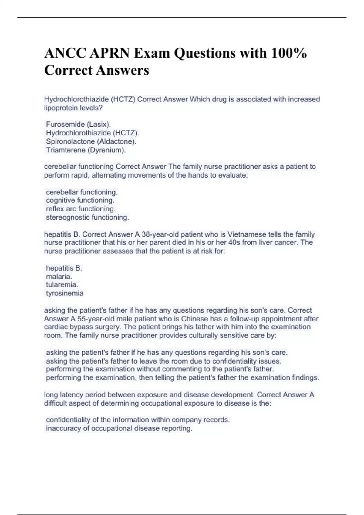 Hydrochlorothiazide (HCTZ) Correct Answer Which drug is associated with increased lipoprotein levels? Furosemide (Lasix). Hydrochlorothiazide (HCTZ). Spironolactone (Aldactone). Triamterene (Dyrenium). cerebellar functioning Correct Answer The family nurse practitioner asks a patient to perform rapid, alternating movements of the hands to evaluate: cerebellar functioning. cognitive functioning. reflex arc functioning. stereognostic functioning. hepatitis B. Correct Answer A 38-year-old patient who is Vietnamese tells the family nurse practitioner that his or her parent died in his or her 40s from liver cancer. The nurse practitioner assesses that the patient is at risk for: hepatitis B. malaria. tularemia. tyrosinemia asking the patient's father if he has any questions regarding his son's care. Correct Answer A 55-year-old male patient who is Chinese has a follow-up appointment after cardiac bypass surgery. The patient brings his father with him into the examination room. The family nurse practitioner provides culturally sensitive care by: asking the patient's father if he has any questions regarding his son's care. asking the patient's father to leave the room due to confidentiality issues. performing the examination without commenting to the patient's father. performing the examination, then telling the patient's father the examination findings. long latency period between exposure and disease development. Correct Answer A difficult aspect of determining occupational exposure to disease is the: confidentiality of the information within company records. inaccuracy of occupational disease reporting.