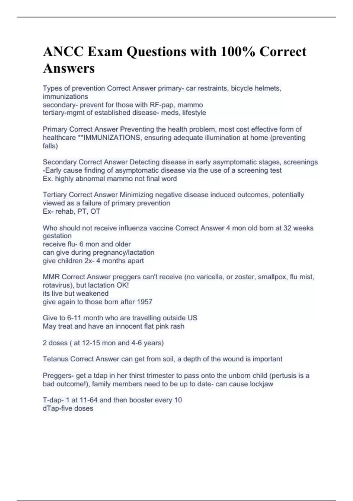 Types of prevention Correct Answer primary- car restraints, bicycle helmets, immunizations secondary- prevent for those with RF-pap, mammo tertiary-mgmt of established disease- meds, lifestyle Primary Correct Answer Preventing the health problem, most cost effective form of healthcare **IMMUNIZATIONS, ensuring adequate illumination at home (preventing falls) Secondary Correct Answer Detecting disease in early asymptomatic stages, screenings -Early cause finding of asymptomatic disease via the use of a screening test Ex. highly abnormal mammo not final word Tertiary Correct Answer Minimizing negative disease induced outcomes, potentially viewed as a failure of primary prevention Ex- rehab, PT, OT Who should not receive influenza vaccine Correct Answer 4 mon old born at 32 weeks gestation receive flu- 6 mon and older can give during pregnancy/lactation give children 2x- 4 months apart MMR Correct Answer preggers can't receive (no varicella, or zoster, smallpox, flu mist, rotavirus), but lactation OK! its live but weakened give again to those born after 1957 Give to 6-11 month who are travelling outside US May treat and have an innocent flat pink rash 2 doses ( at 12-15 mon and 4-6 years) Tetanus Correct Answer can get from soil, a depth of the wound is important Preggers- get a tdap in her thirst trimester to pass onto the unborn child (pertusis is a bad outcome!), family members need to be up to date- can cause lockjaw T-dap- 1 at 11-64 and then booster every 10 dTap-five doses