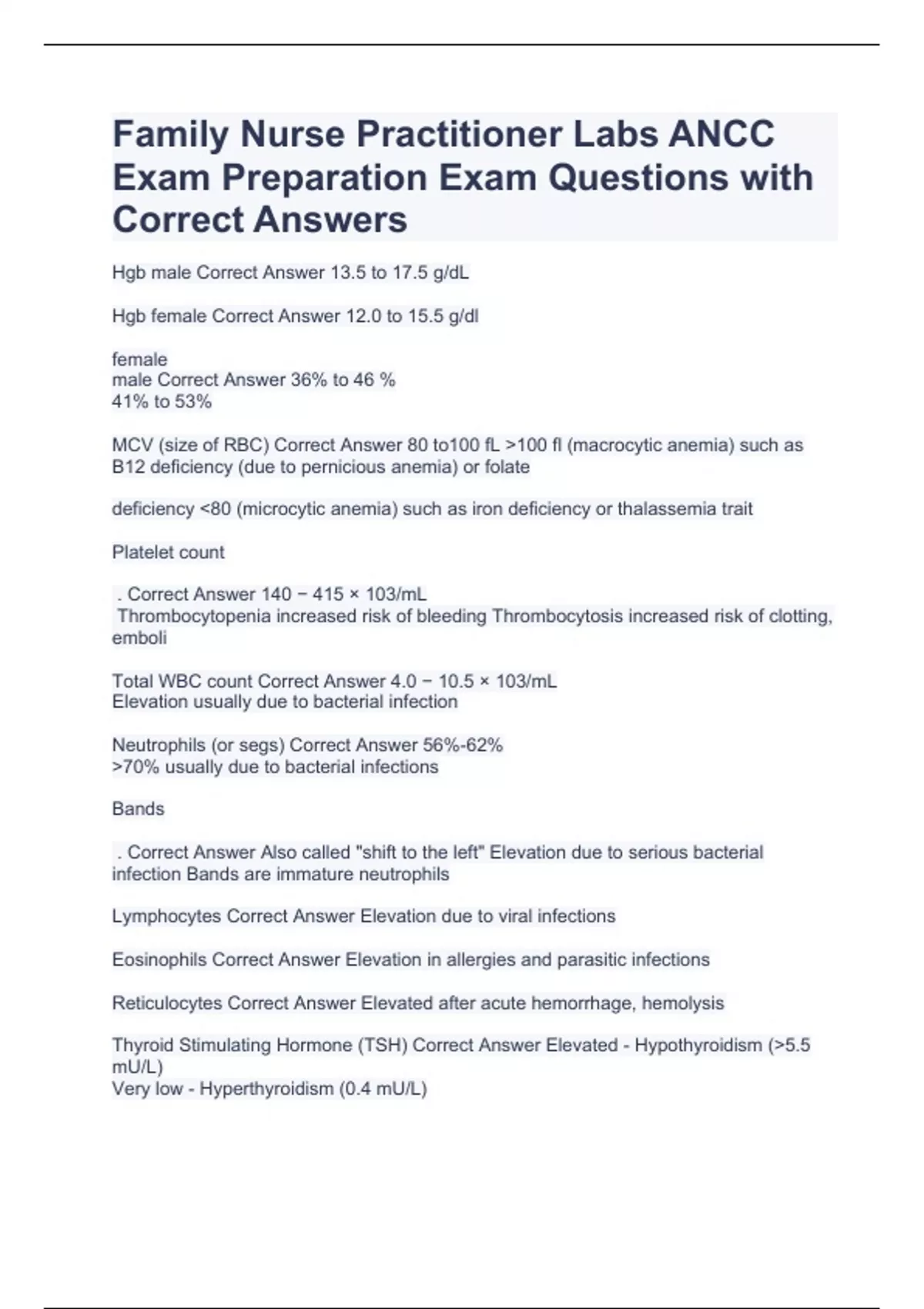 Hgb male Correct Answer 13.5 to 17.5 g/dL Hgb female Correct Answer 12.0 to 15.5 g/dl female male Correct Answer 36% to 46 % 41% to 53% MCV (size of RBC) Correct Answer 80 to100 fL >100 fl (macrocytic anemia) such as B12 deficiency (due to pernicious anemia) or folate deficiency <80 (microcytic anemia) such as iron deficiency or thalassemia trait Platelet count . Correct Answer 140 − 415 × 103/mL Thrombocytopenia increased risk of bleeding Thrombocytosis increased risk of clotting, emboli Total WBC count Correct Answer 4.0 − 10.5 × 103/mL Elevation usually due to bacterial infection Neutrophils (or segs) Correct Answer 56%-62% >70% usually due to bacterial infections Bands . Correct Answer Also called "shift to the left" Elevation due to serious bacterial infection Bands are immature neutrophils Lymphocytes Correct Answer Elevation due to viral infections Eosinophils Correct Answer Elevation in allergies and parasitic infections Reticulocytes Correct Answer Elevated after acute hemorrhage, hemolysis Thyroid Stimulating Hormone (TSH) Correct Answer Elevated - Hypothyroidism (>5.5 mU/L) Very low - Hyperthyroidism (0.4 mU/L)
