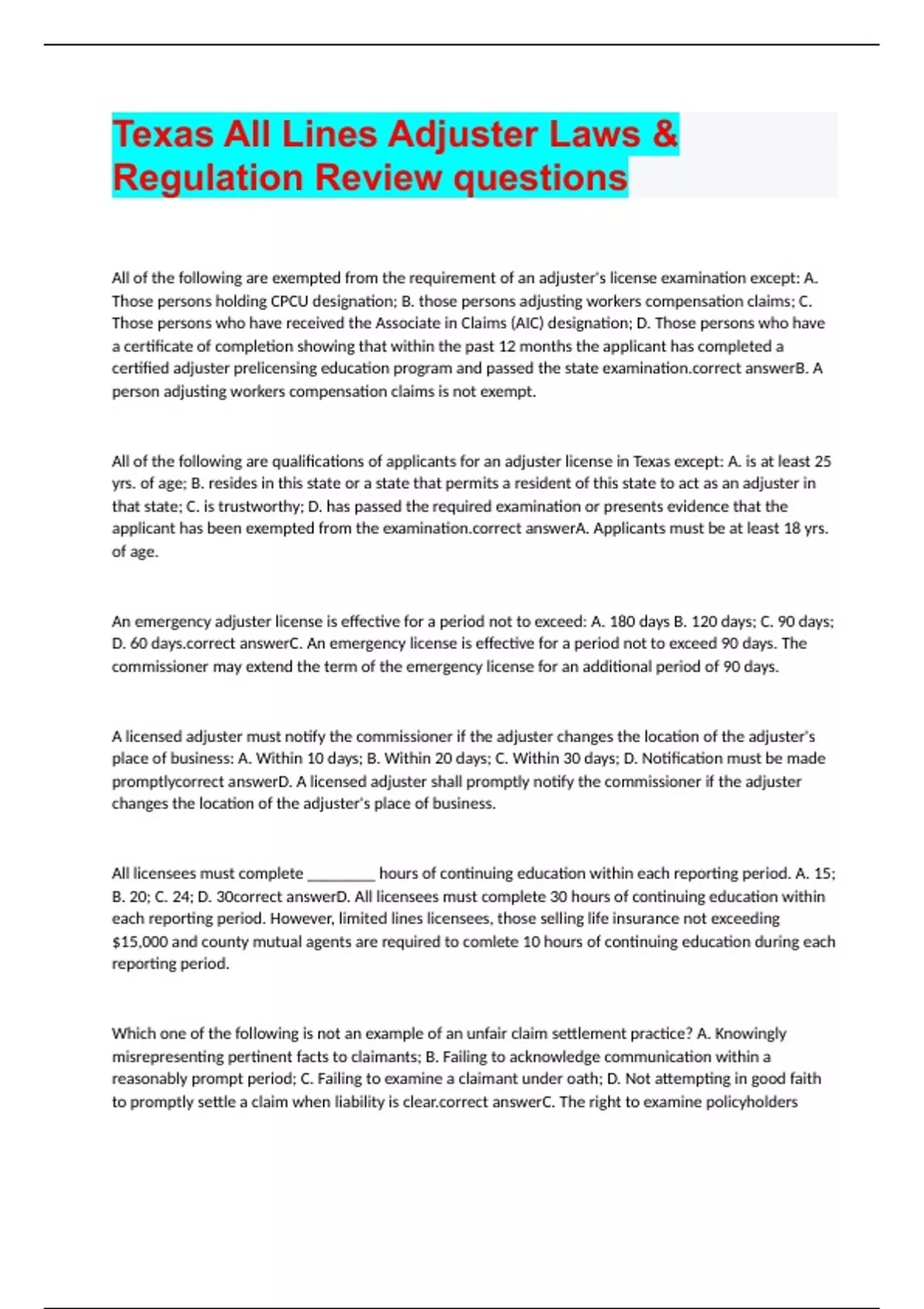 Texas All Lines Adjuster Laws & Regulation Review questions questions with correct answers